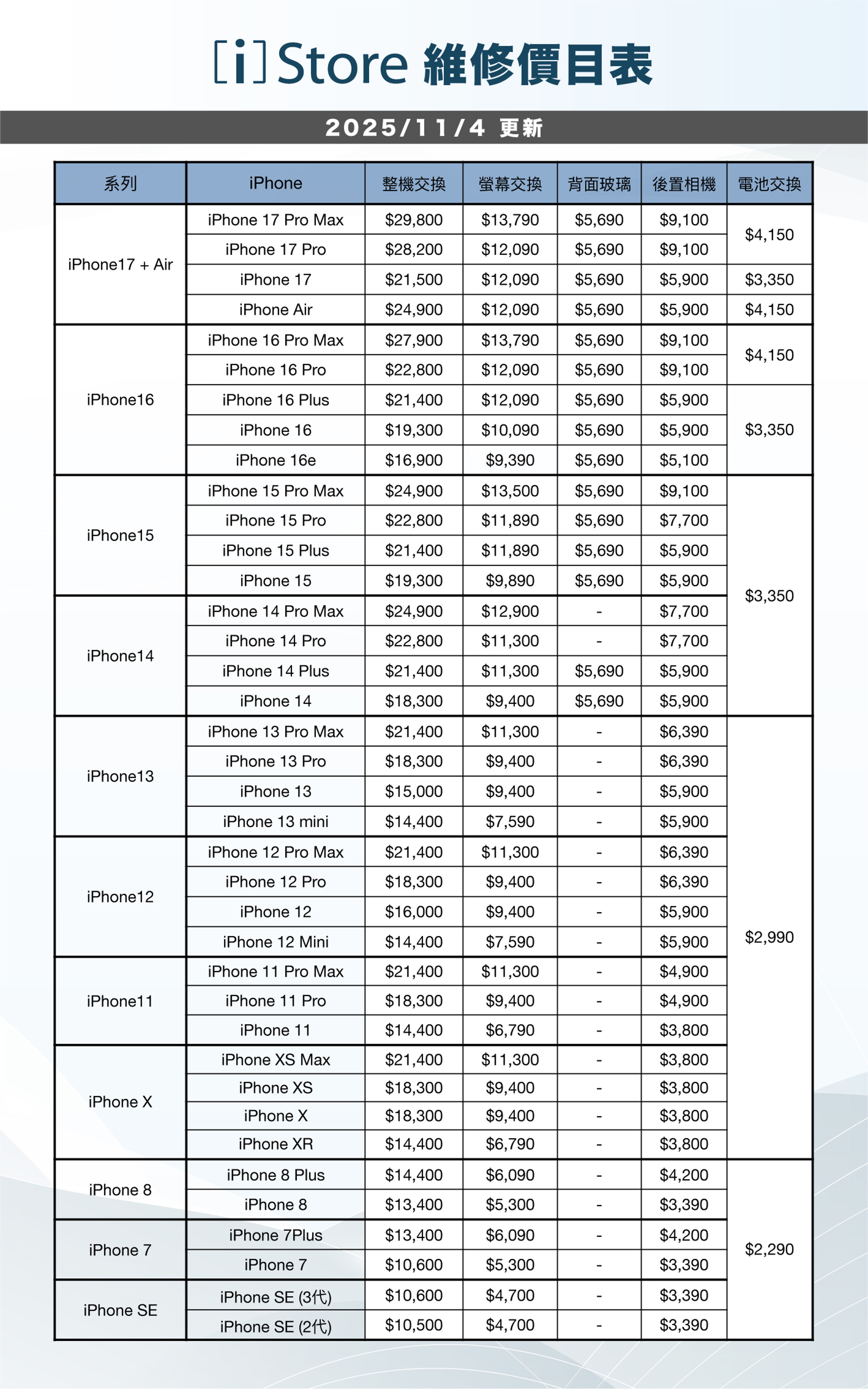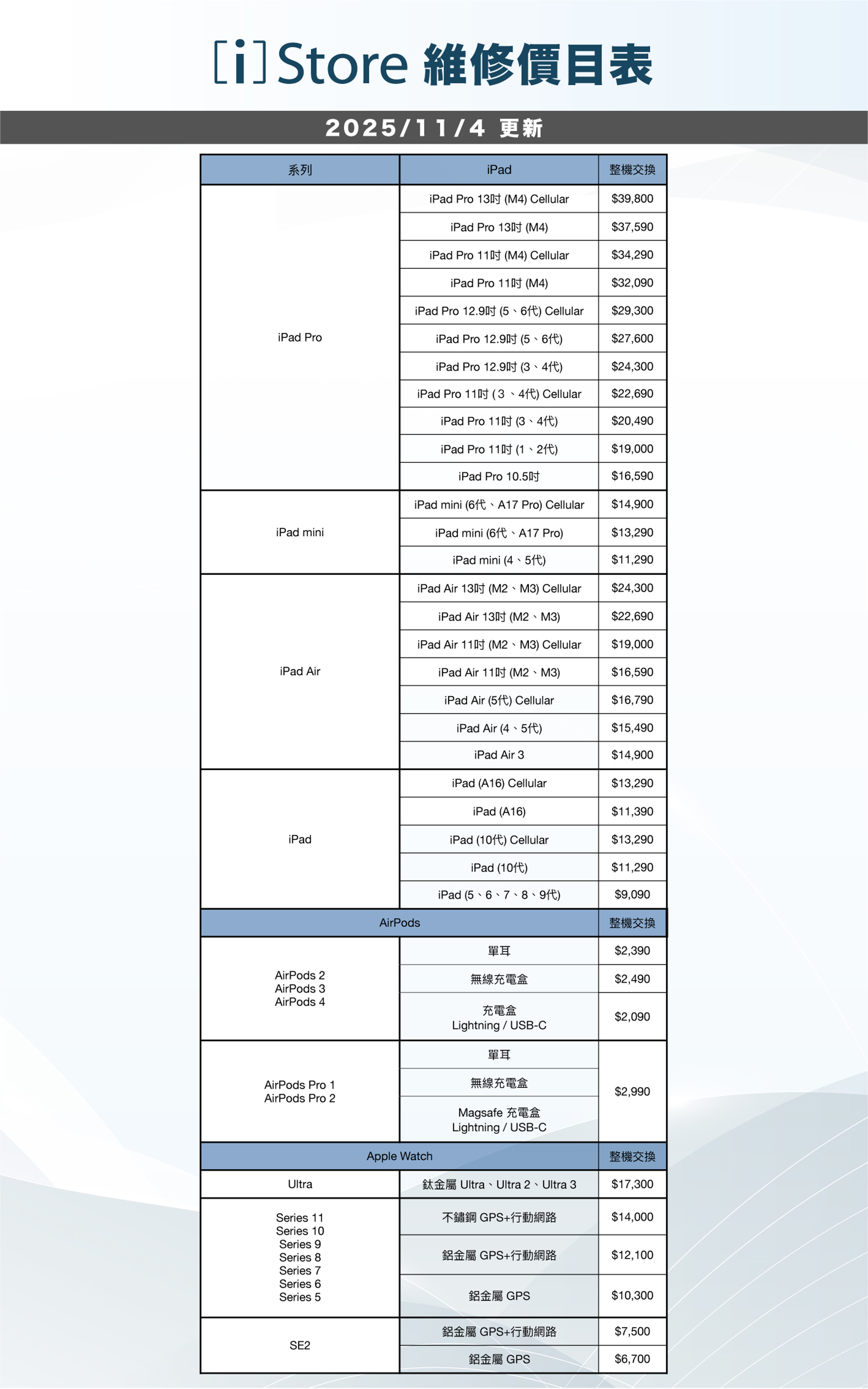 2025/11/04 維修料件價目表 「此價格僅供參考,實際價格依維修中心報價為主」