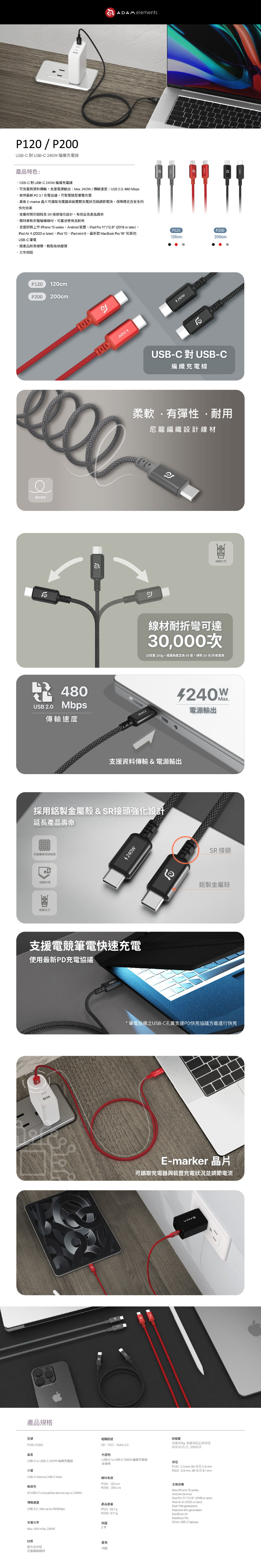 - 可充電與資料傳輸,支援電源輸出:Max 240W(48V, 5A)/傳輸速度:USB 2.0, 480Mbps。