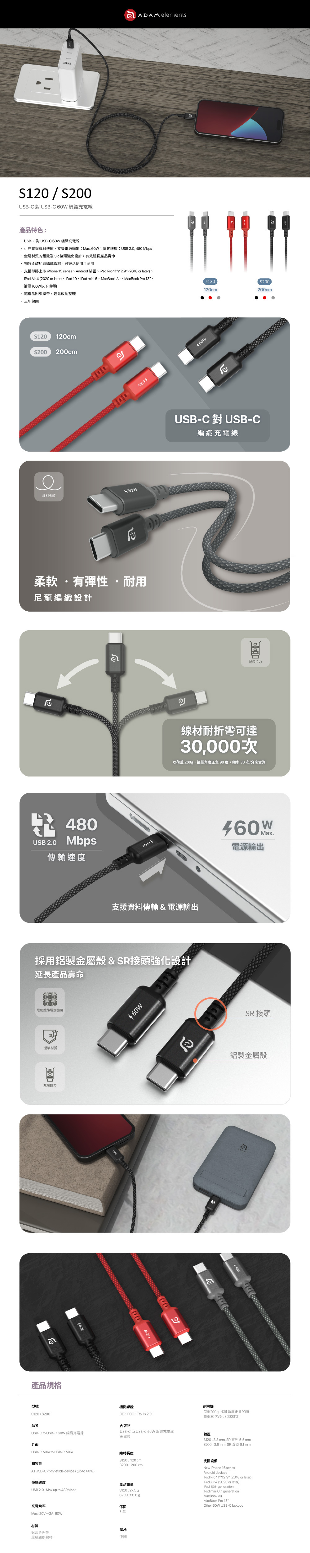 - 可充電與資料傳輸,支援電源輸出:Max 60W(20V, 3A);傳輸速度:USB 2.0, 480Mbps。