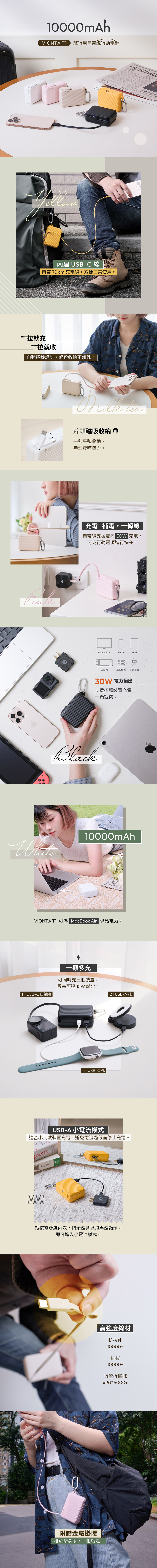 - 隱藏式捲線方式,將USB-C線材以抽拉的方式自然捲進行動電源機身空間,最長可拉伸至70cm。
