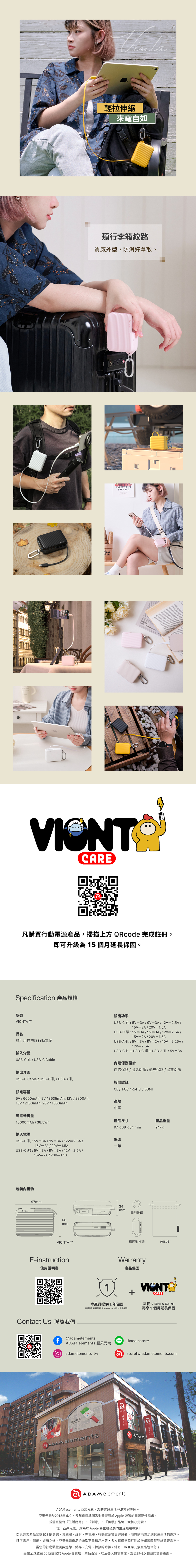 - 內建10000mAh行動電源,搭配旅行箱外型,小巧體積提供滿滿的電力。
