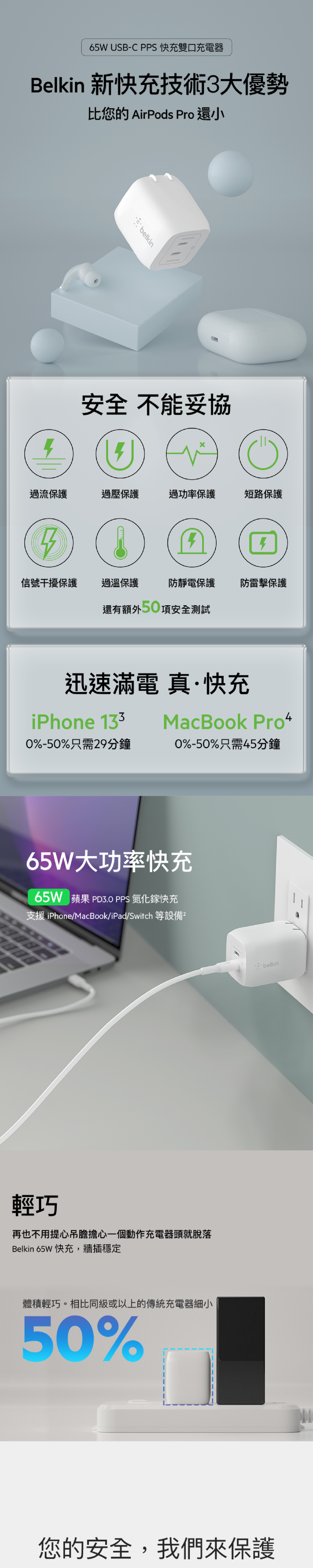- 使用功能強大且精巧的 65W 雙 USB-C充電器為您的 MacBook和 iPhone 充電。