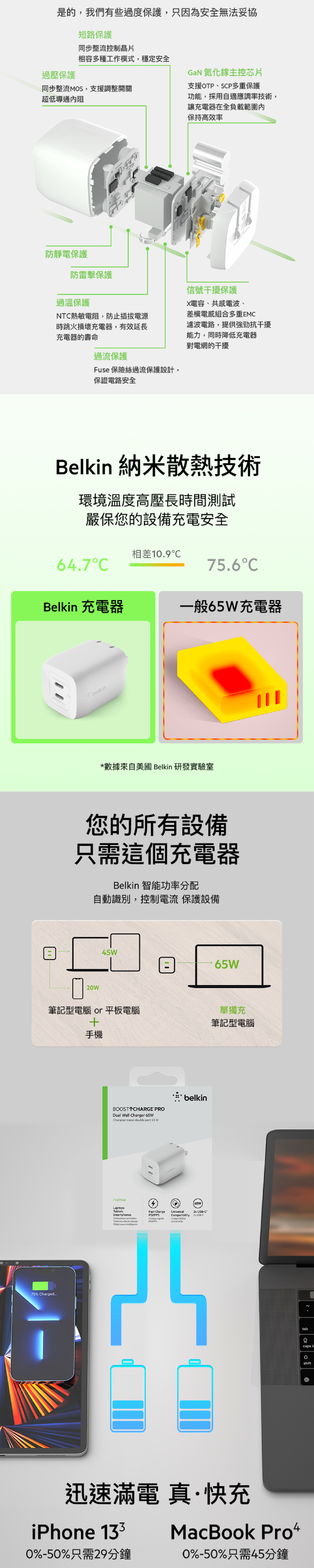 - 單孔使用時可獲得高達 65W 的功率,雙孔使用時可獲得高達 45W + 20W 的功率同時為兩個裝置充電。