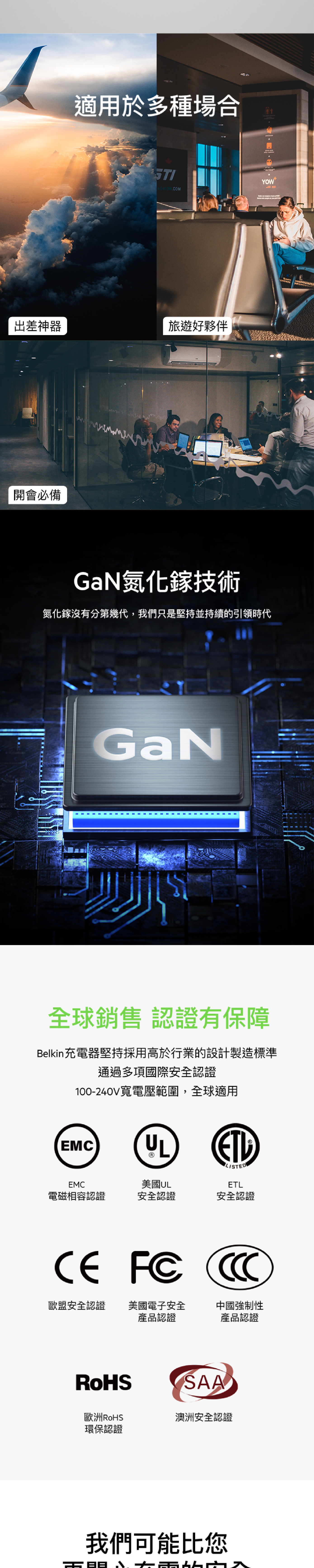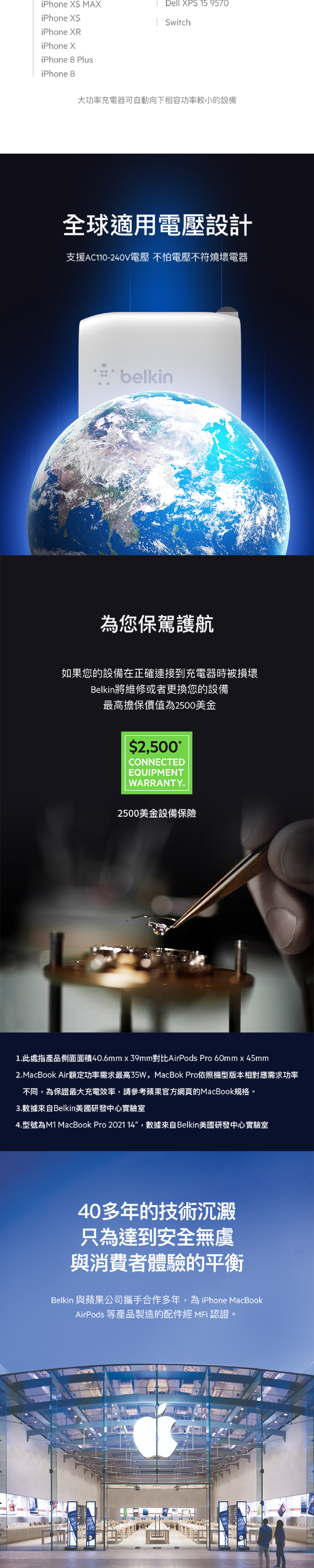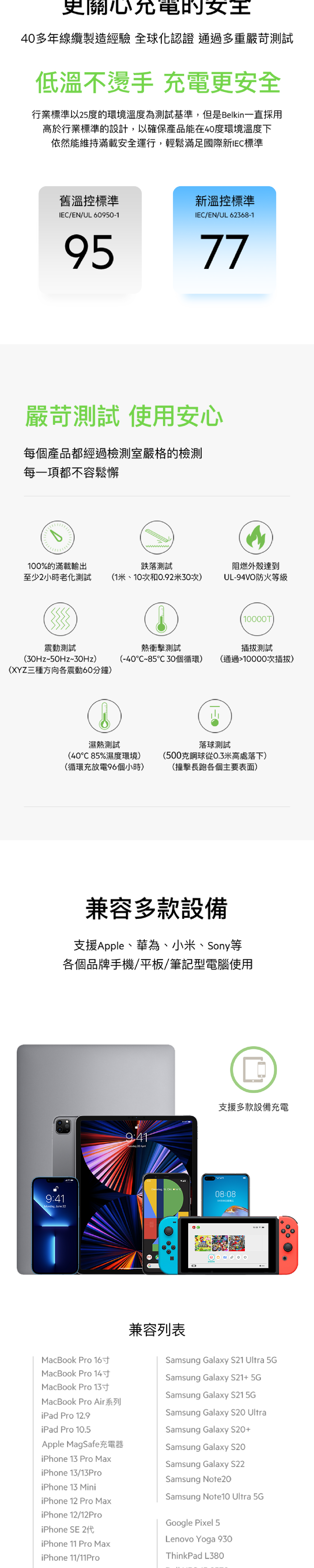 - 它採用 GaN、USB-C PD 3.0 和 PPS 充電技術設計,可為 Apple 和 Samsung 提供快速安全的充電。