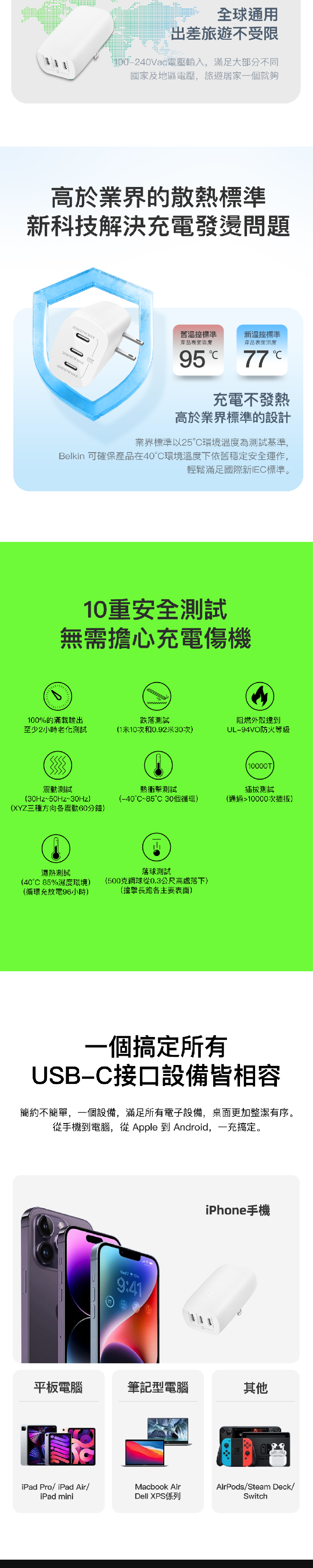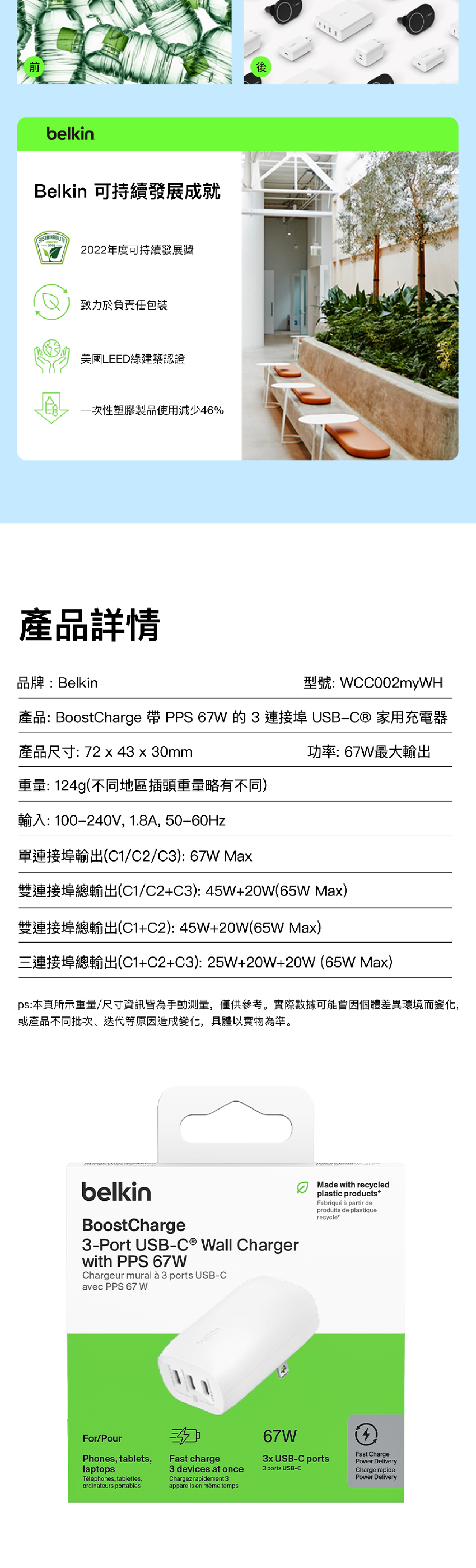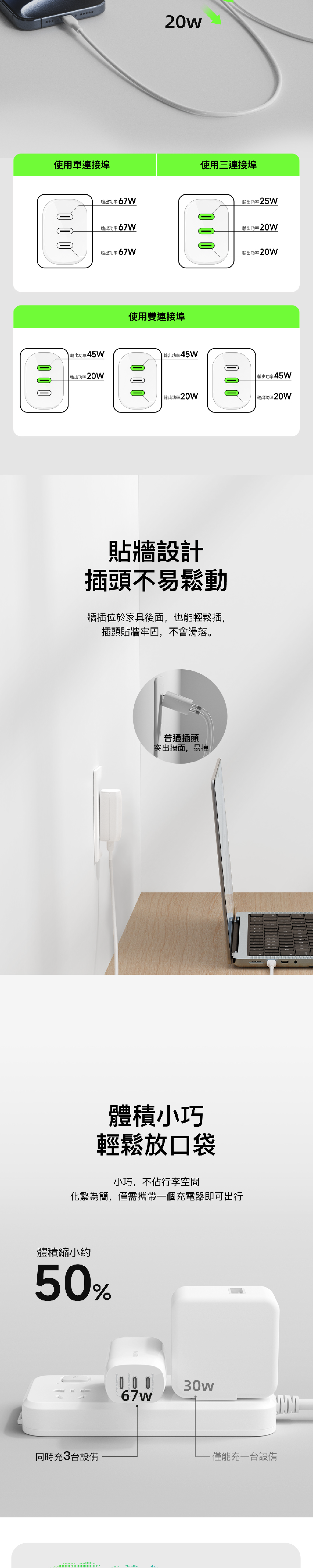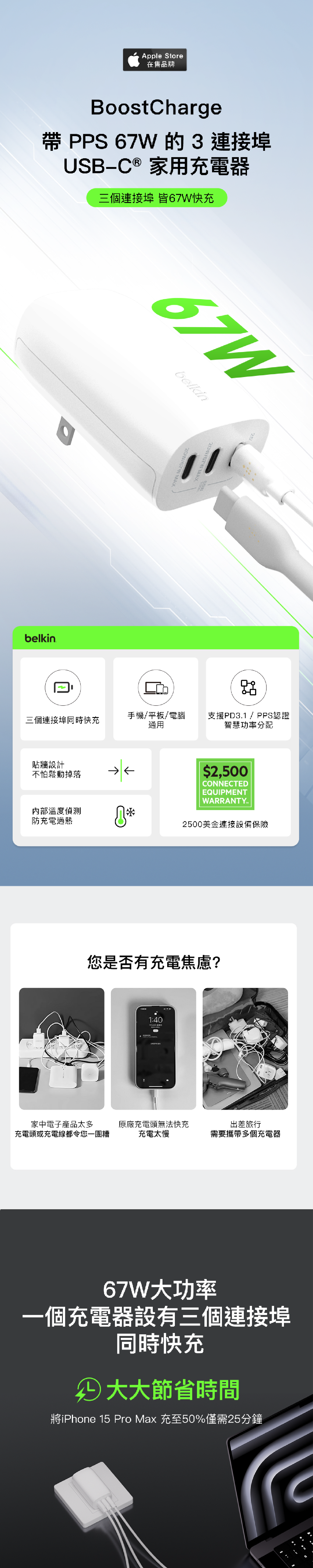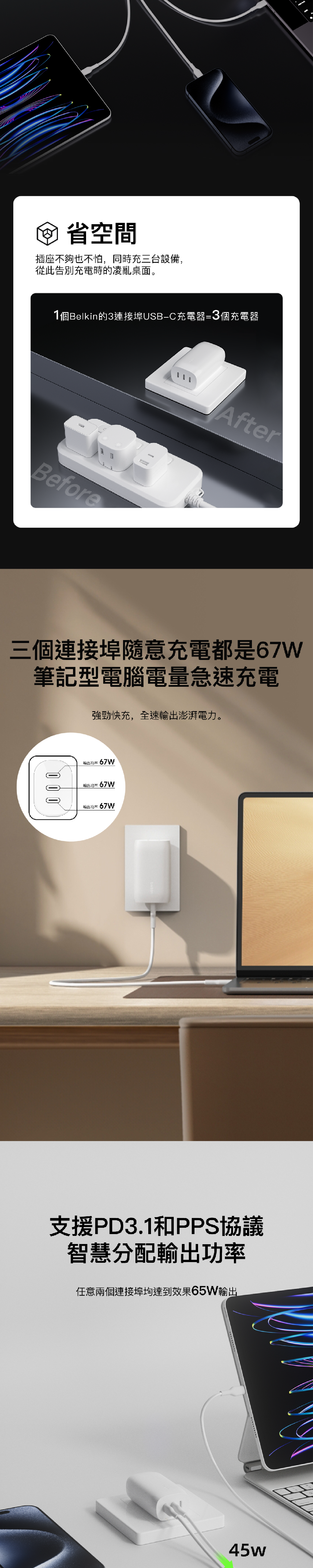 - 使用我們配備 PPS 67W 的 3 連接埠 USB-C充電器,可一次為三部裝置快速充電,或以 67W 的功率為筆記型電腦充電。