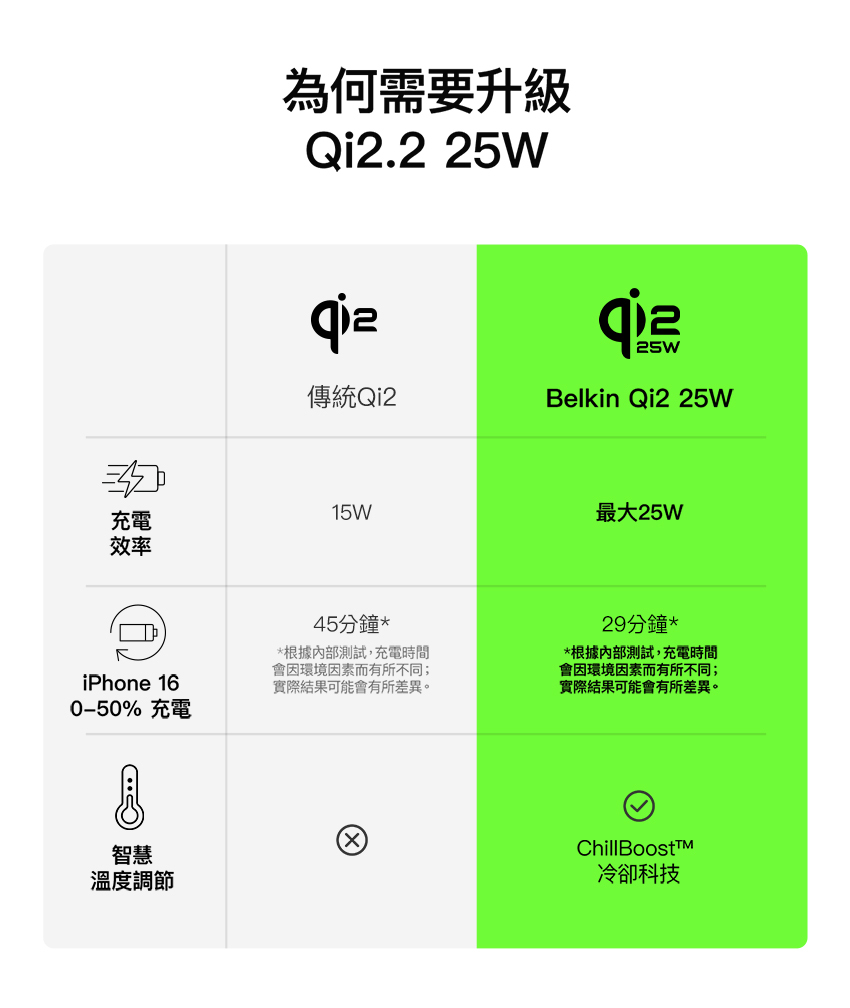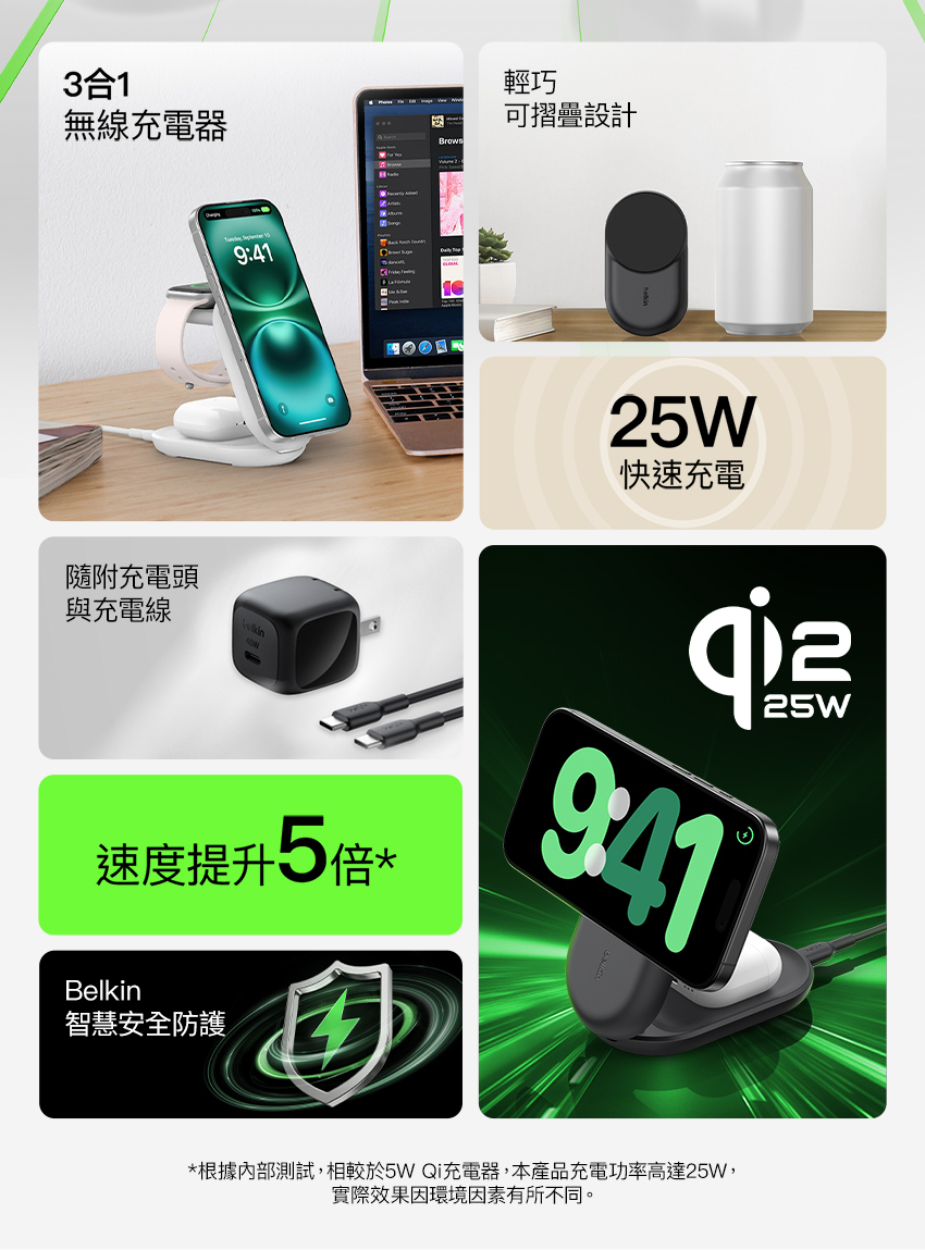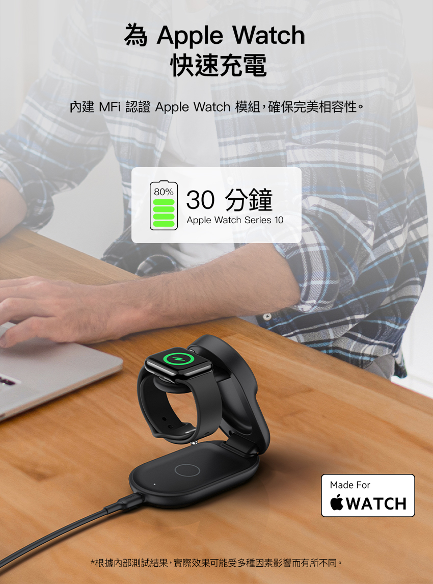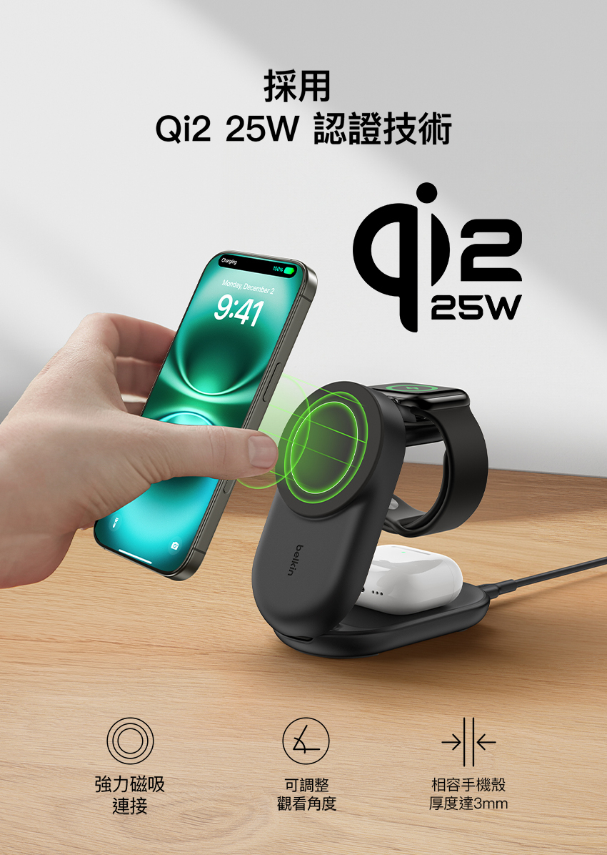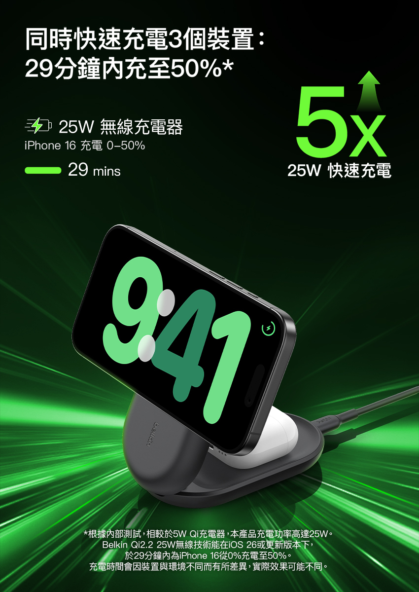 採用 ChillBoost™,這是我們專為減少熱量而設計的被動冷卻技術,您可以使用 Qi2 25W 或 MagSafe 25W 技術同時為三台設備(iPhone、AirPods 或 Apple Watch)快速安全充電。