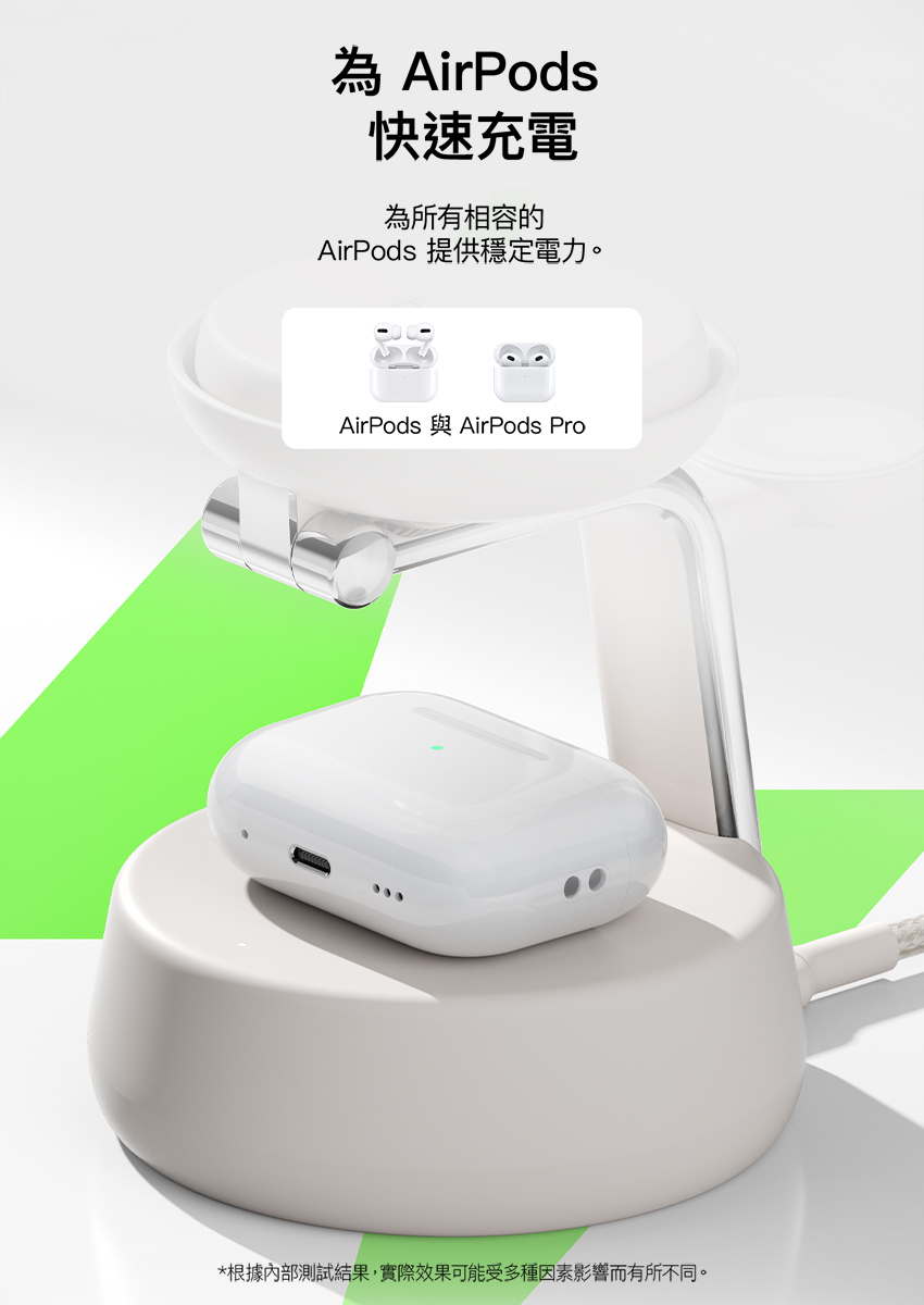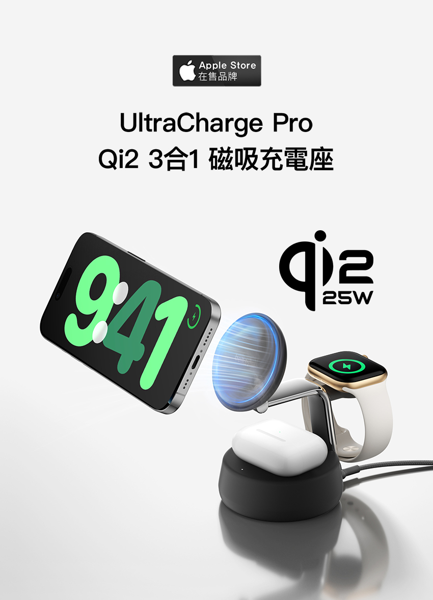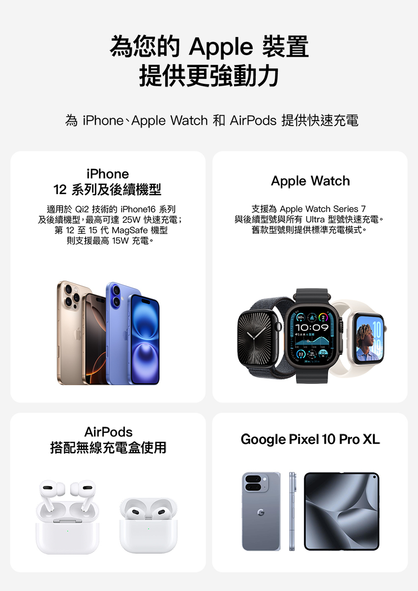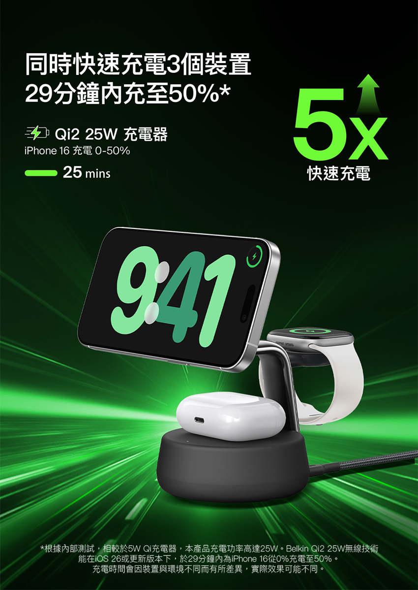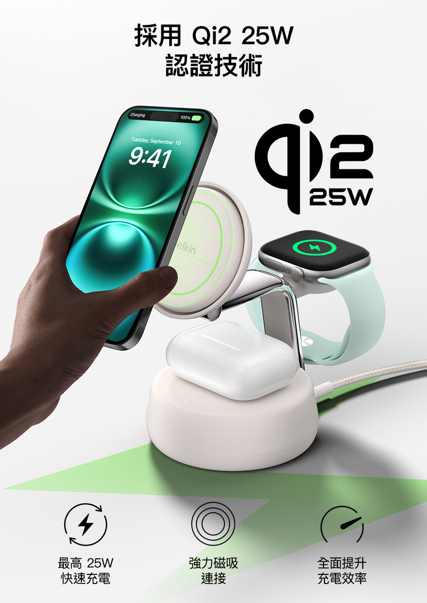 使用 Qi2 25W 或 MagSafe 25W 技術可同時為多達三台裝置(iPhone、Apple Watch 和 AirPods)快速安全充電。