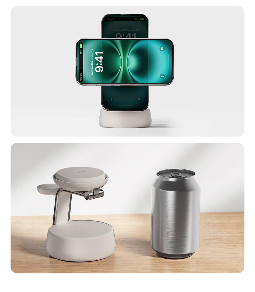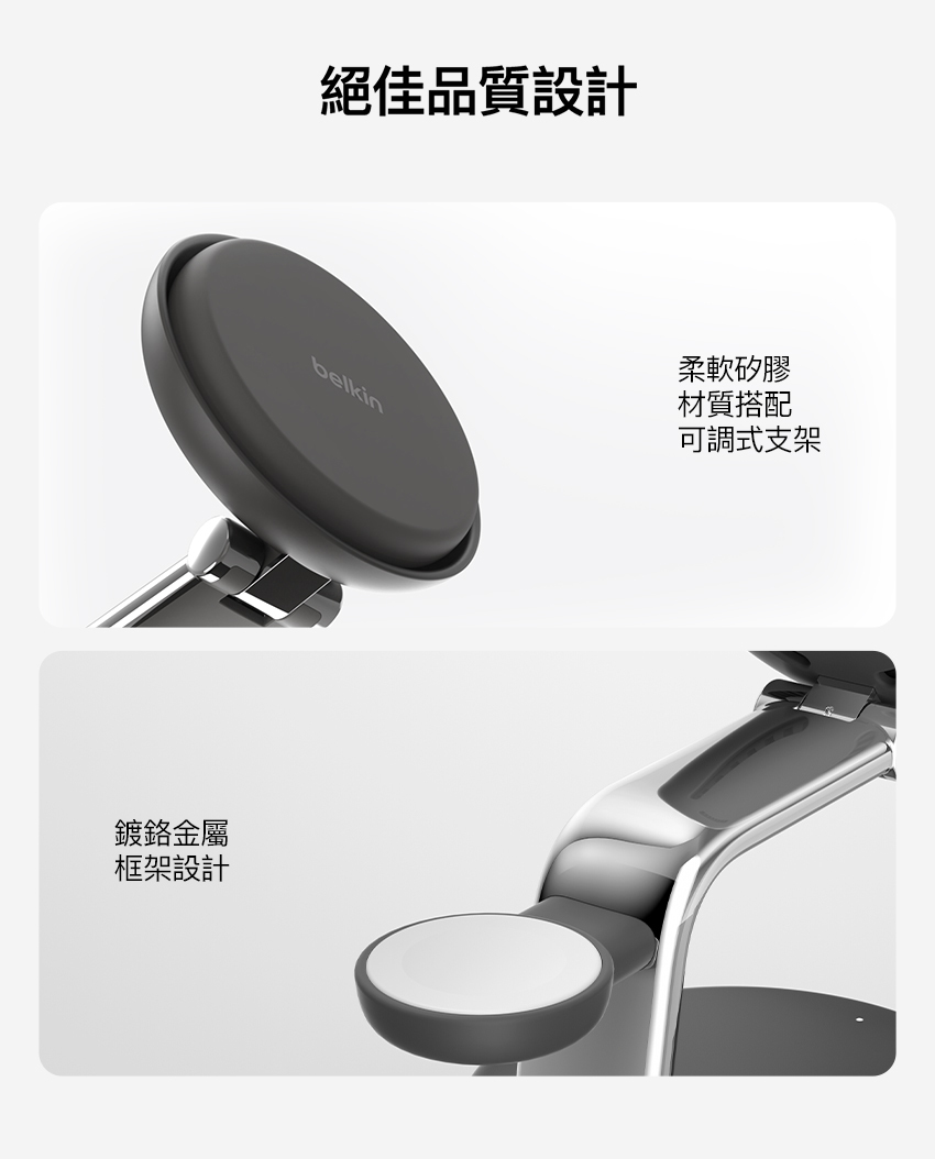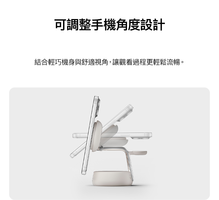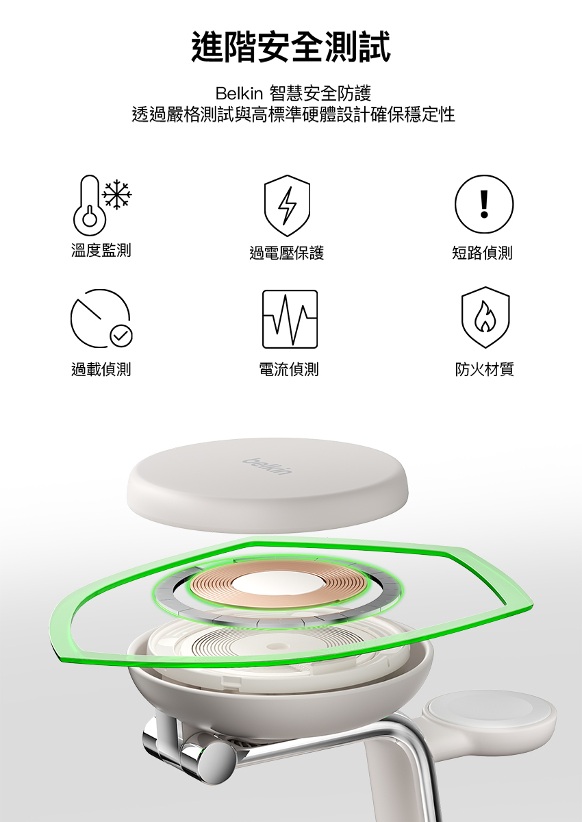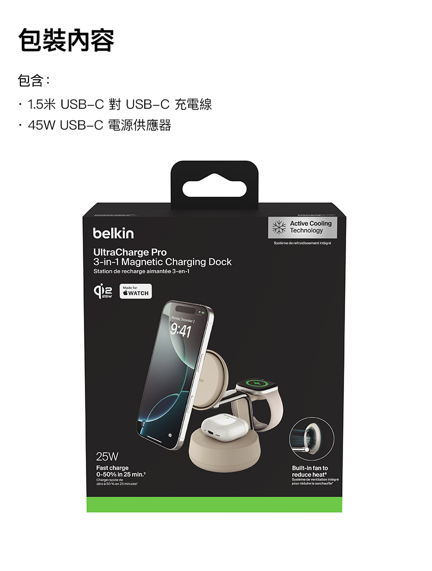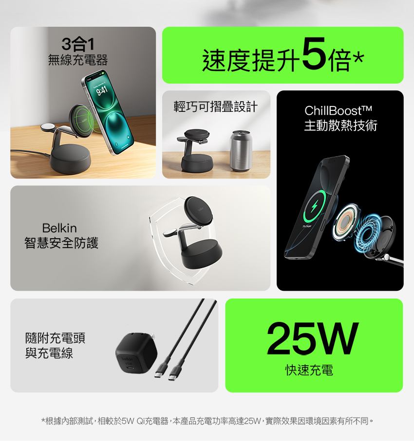 使用 Qi2 25W 或 MagSafe 25W 技術可同時為多達三台裝置(iPhone、Apple Watch 和 AirPods)快速安全充電。