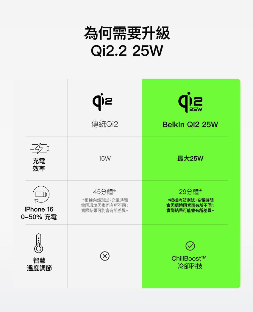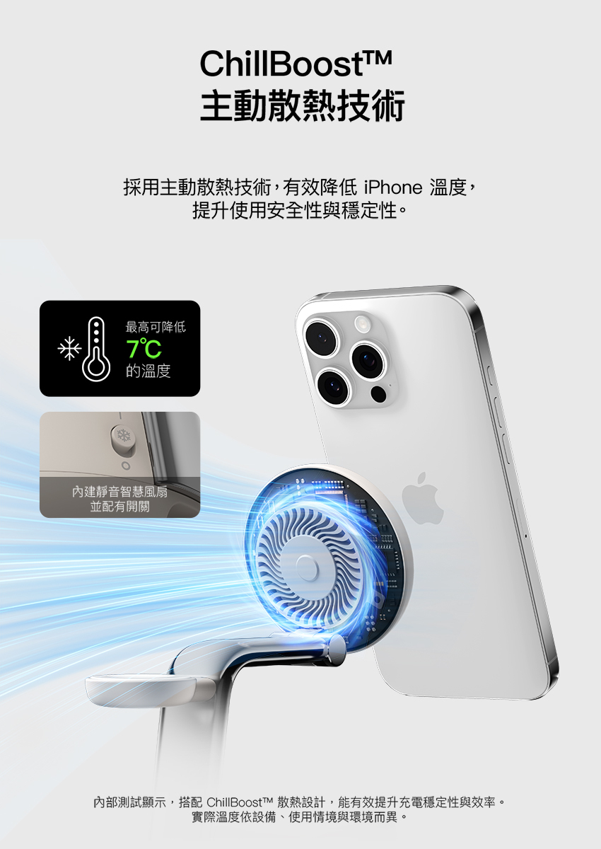 僅需 25 分鐘即可從 0% 至 50% 為 iPhone 充電。採用 ChillBoost™主動冷卻技術,這項專有技術可在快速充電過程調節裝置溫度。
