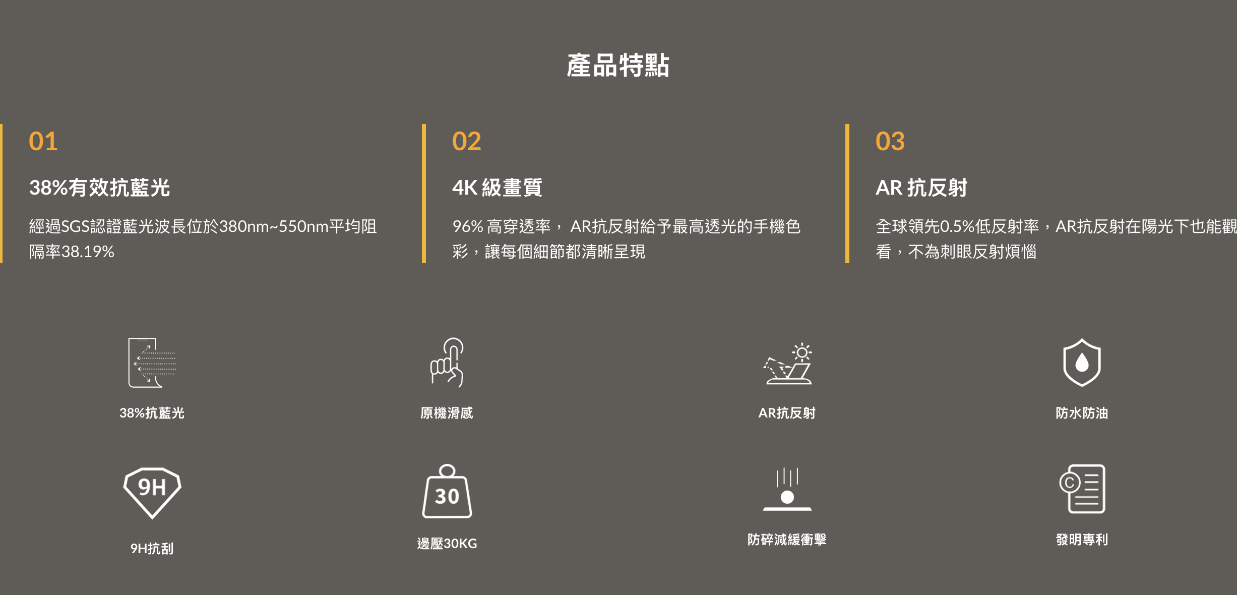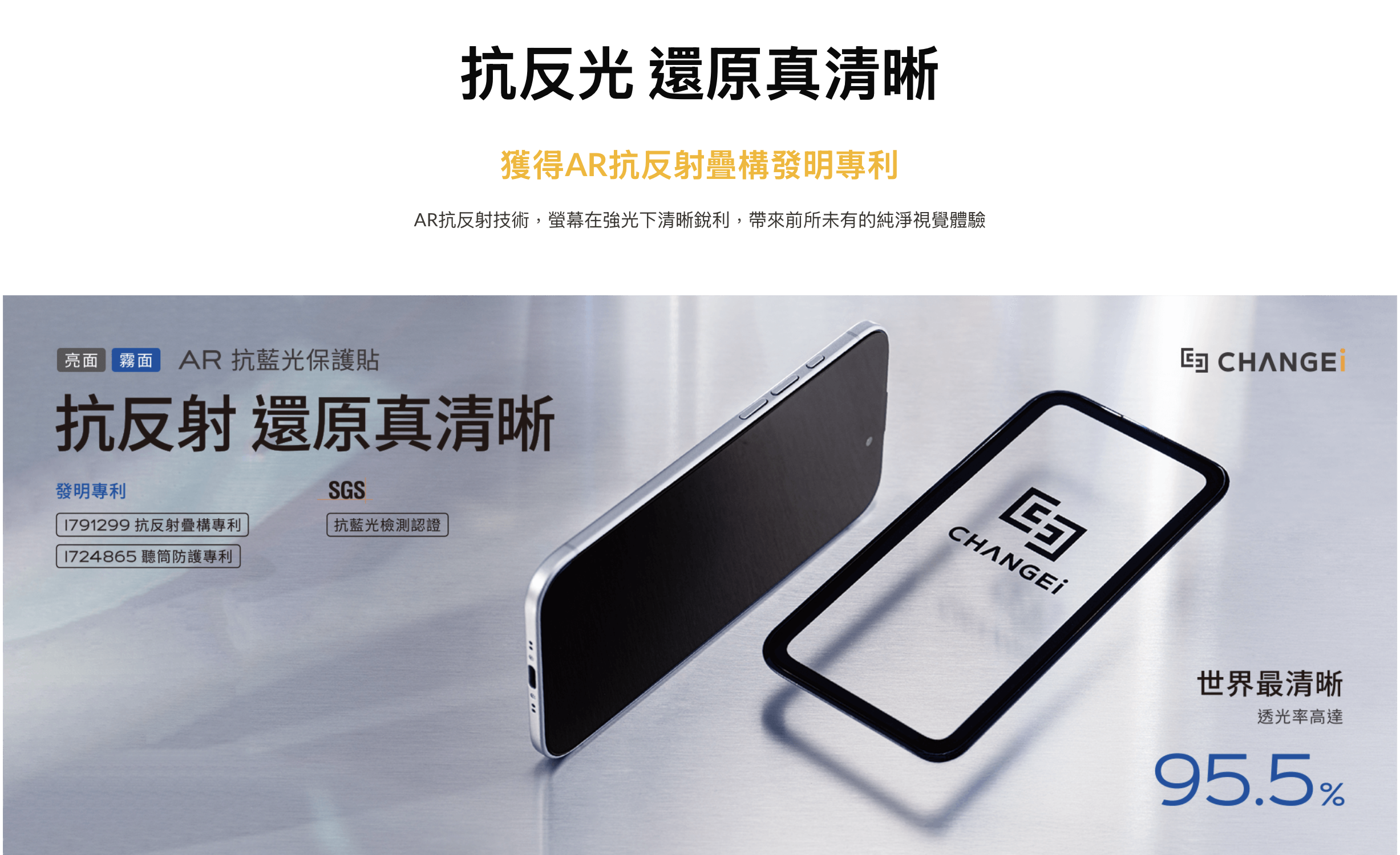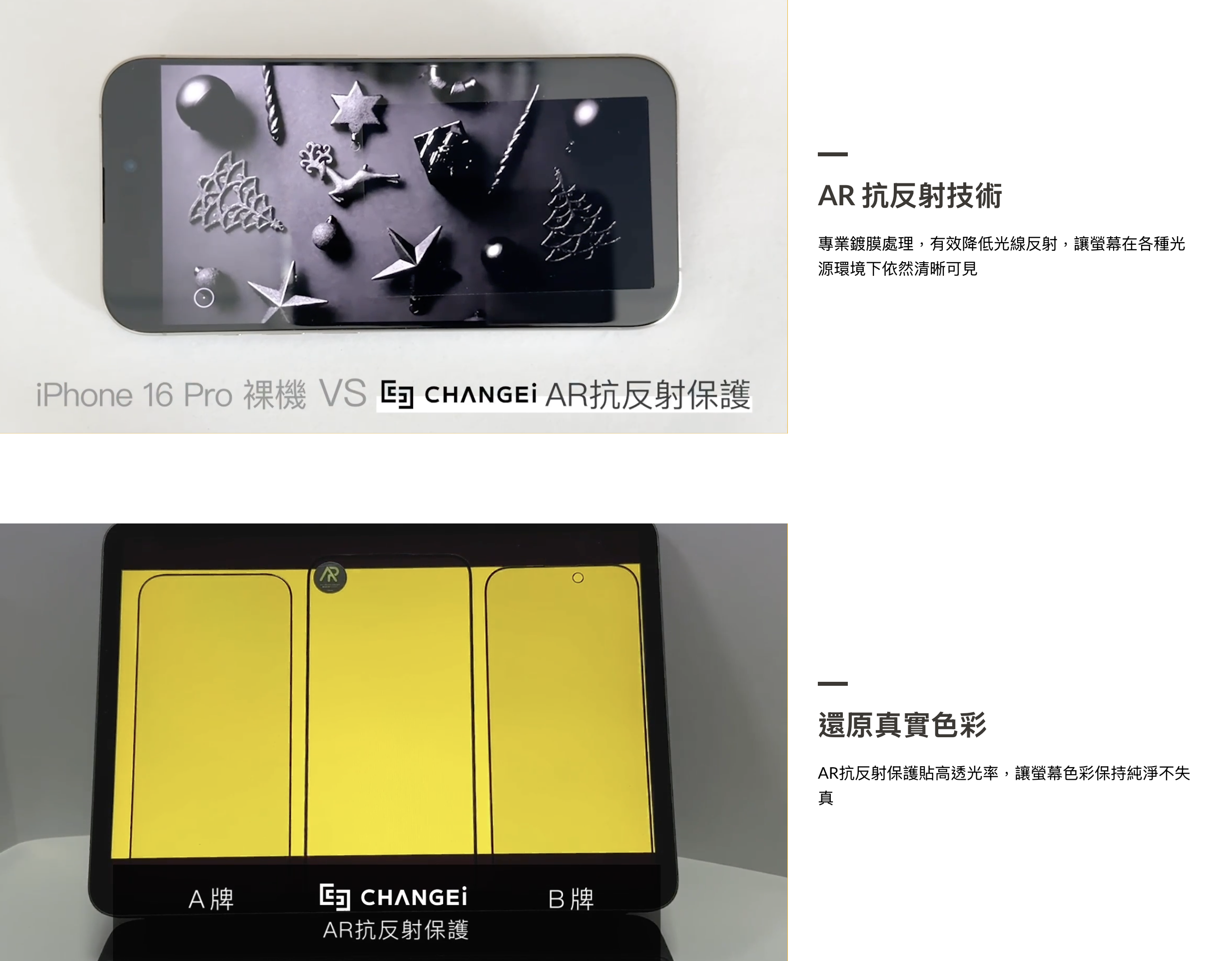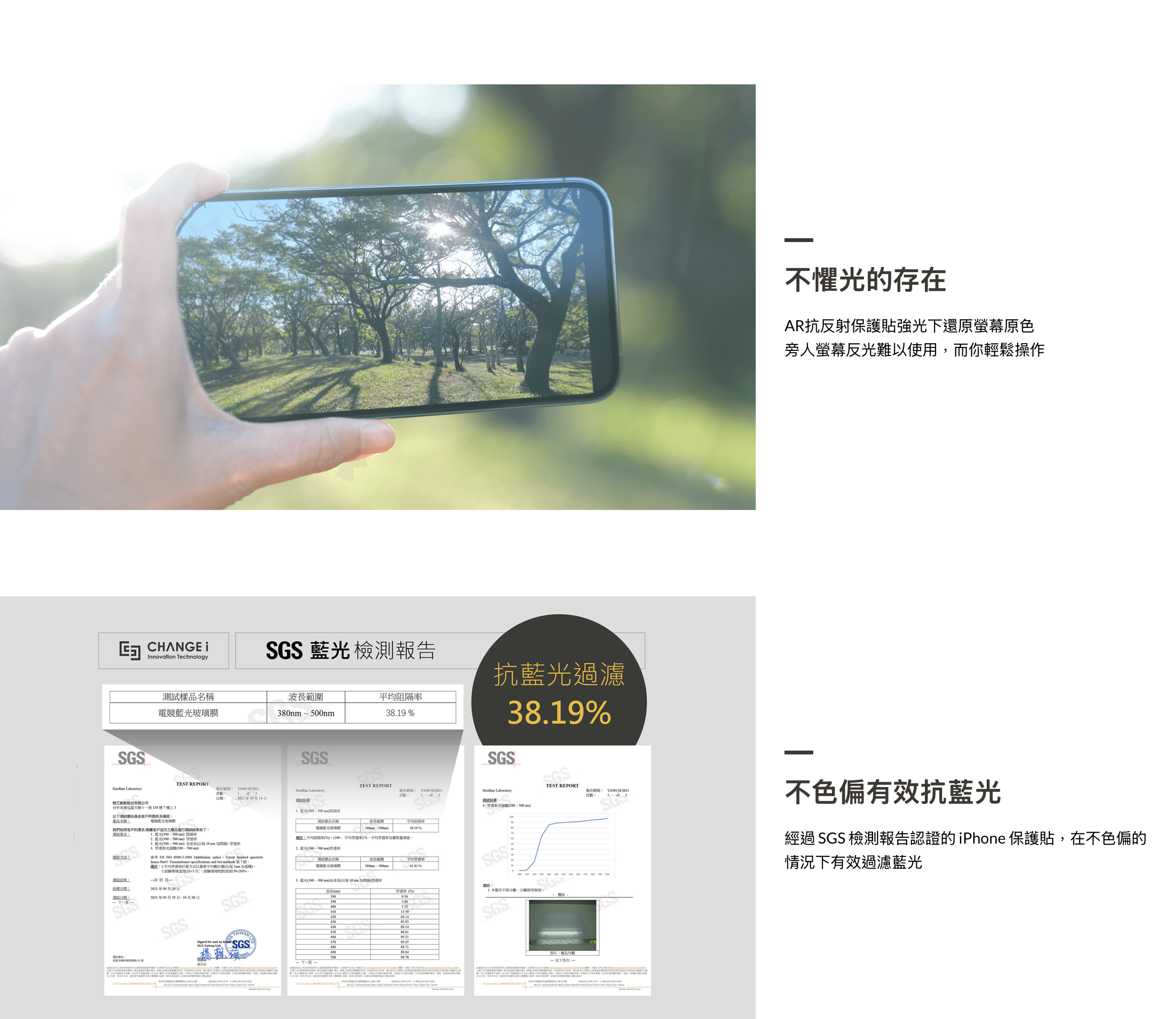 - AR抗反射保護貼強光下還原螢幕原色經過 SGS 檢測報告認證的 iPhone 保護貼,在不色偏的情況下有效過濾藍光