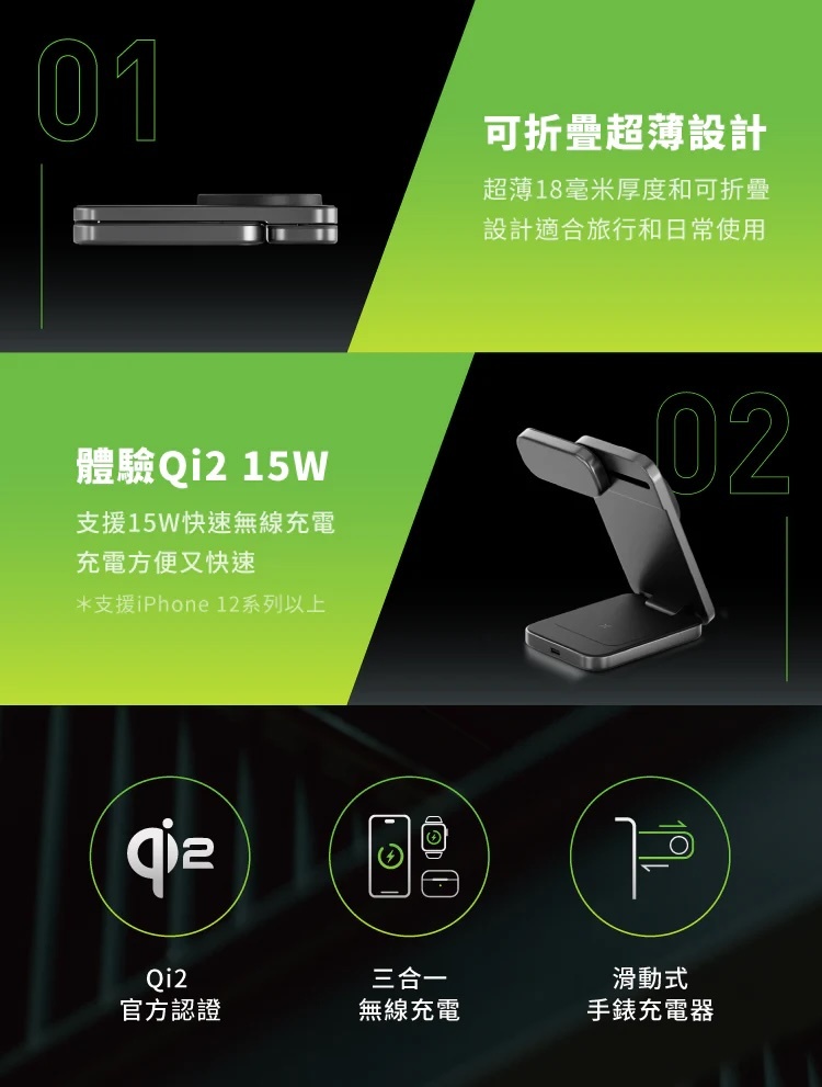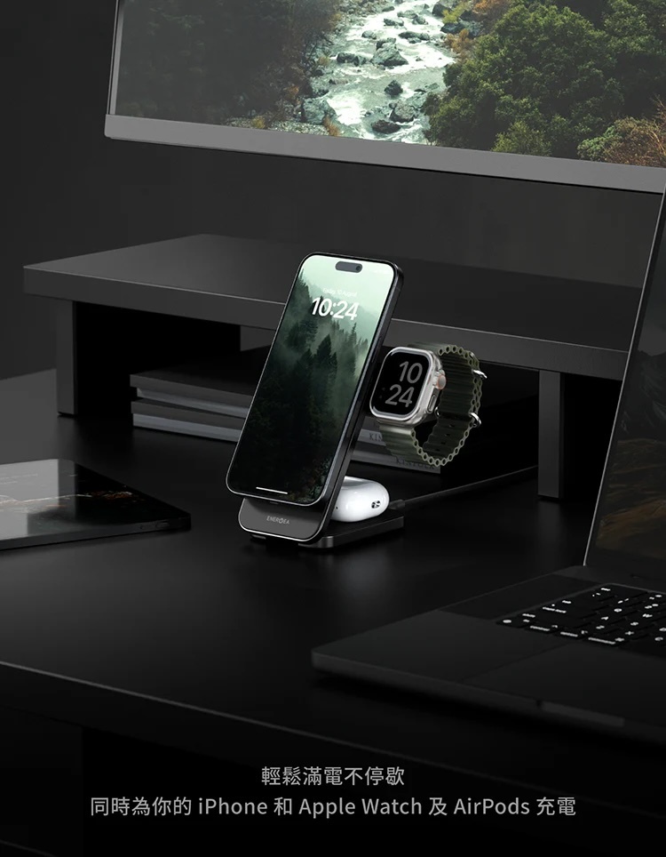 - 三合一無線充電站:手機、耳機、手錶多設備一次充滿電。