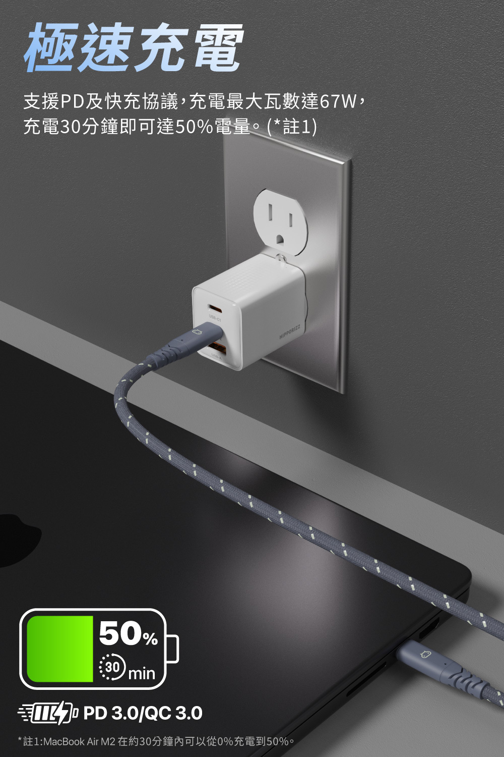 - 智慧分配電力,30分鐘為MacBook Air M2充電達50%。