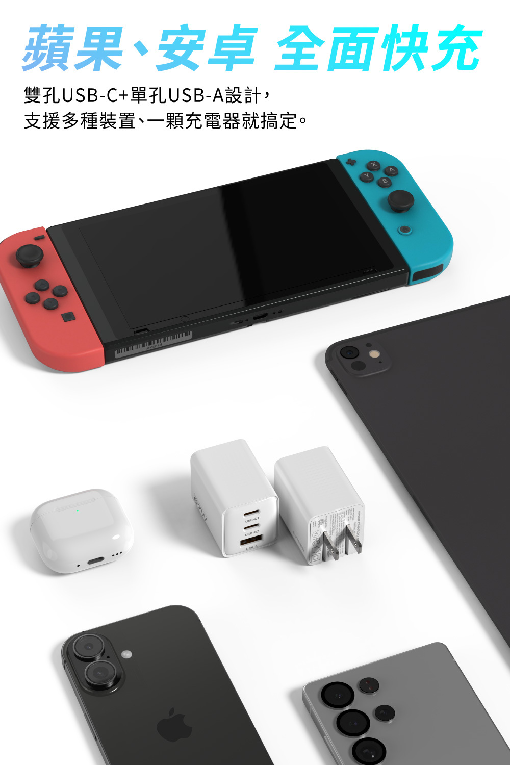 - 三孔快充設計,體積最迷你攜帶方便 。