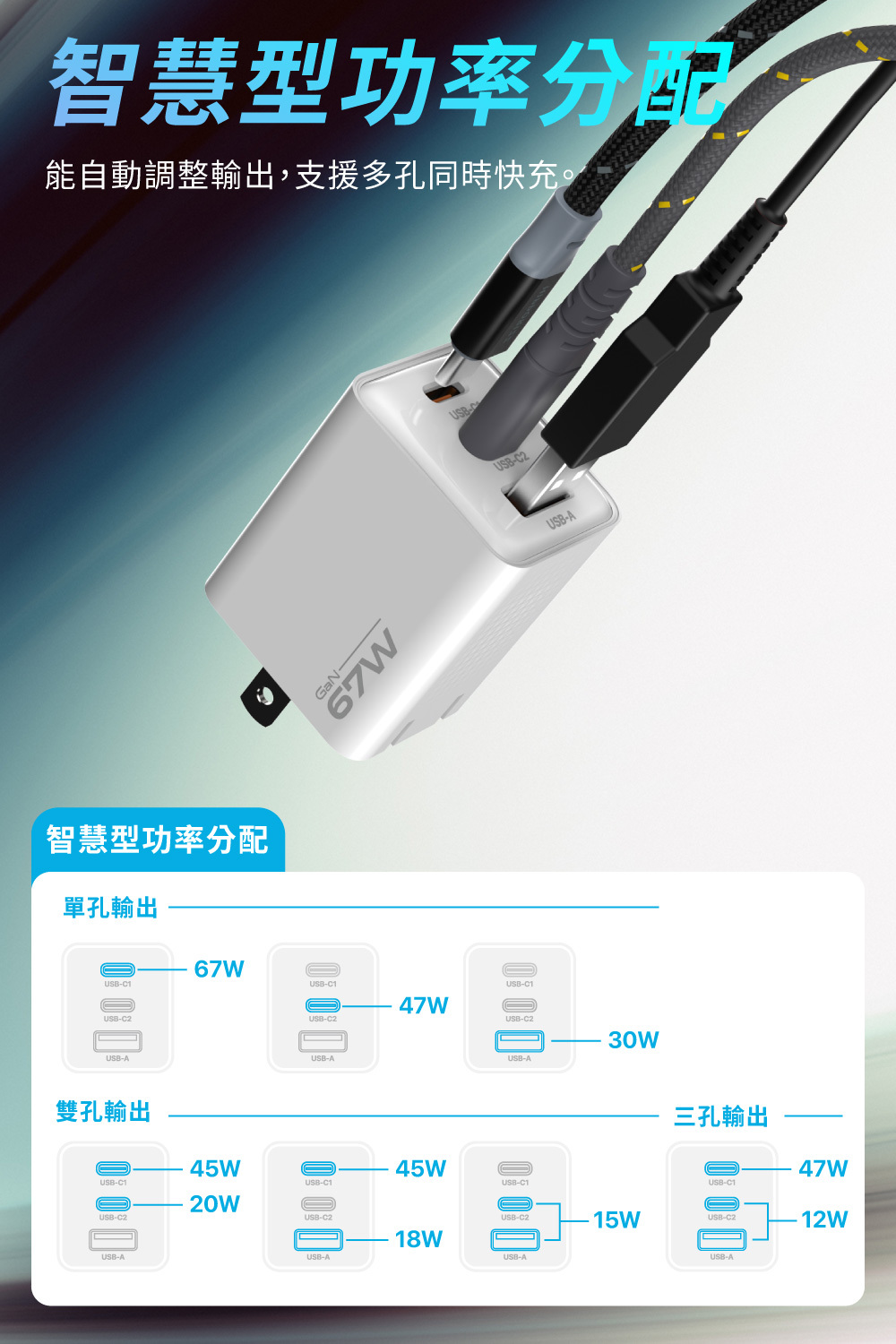 - 單孔支援最高47W,雙孔同時各支援22.5W。