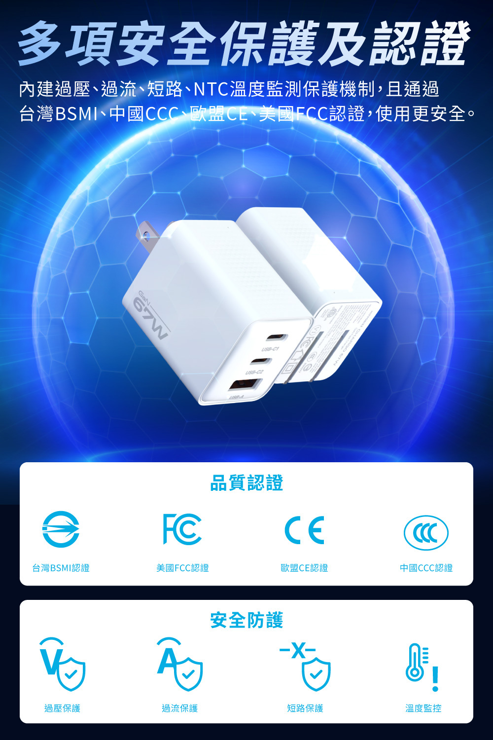- 通過BSMI、CCC、CE、FCC認證。