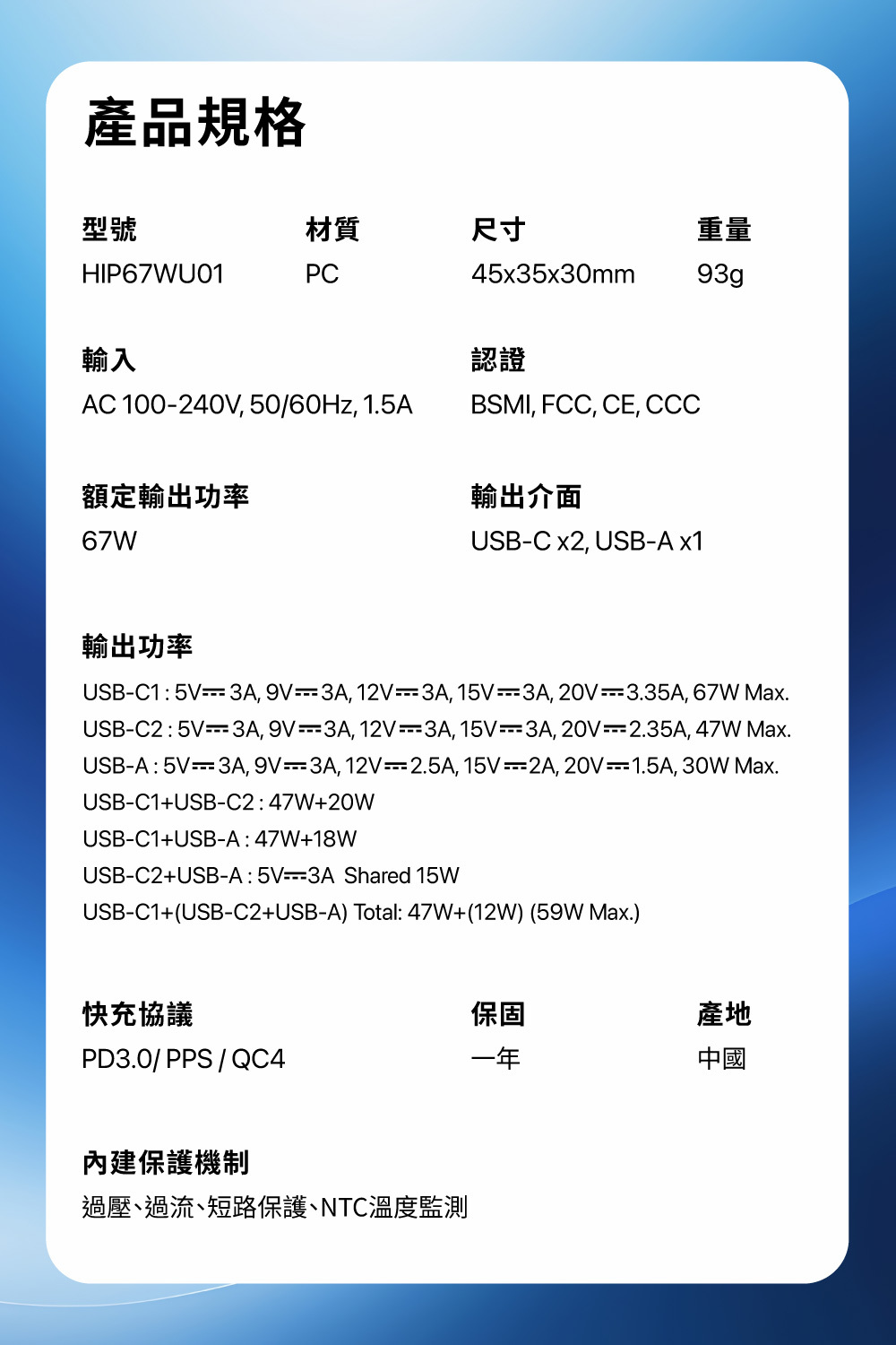- 內建短路、過熱、過壓等多重保護,一年保固。