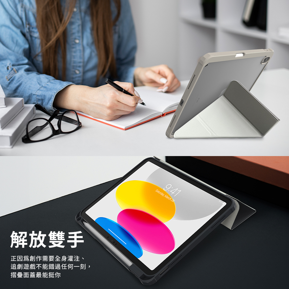 ● 多角度站立面蓋設計,適用於各種iPad使用情境。