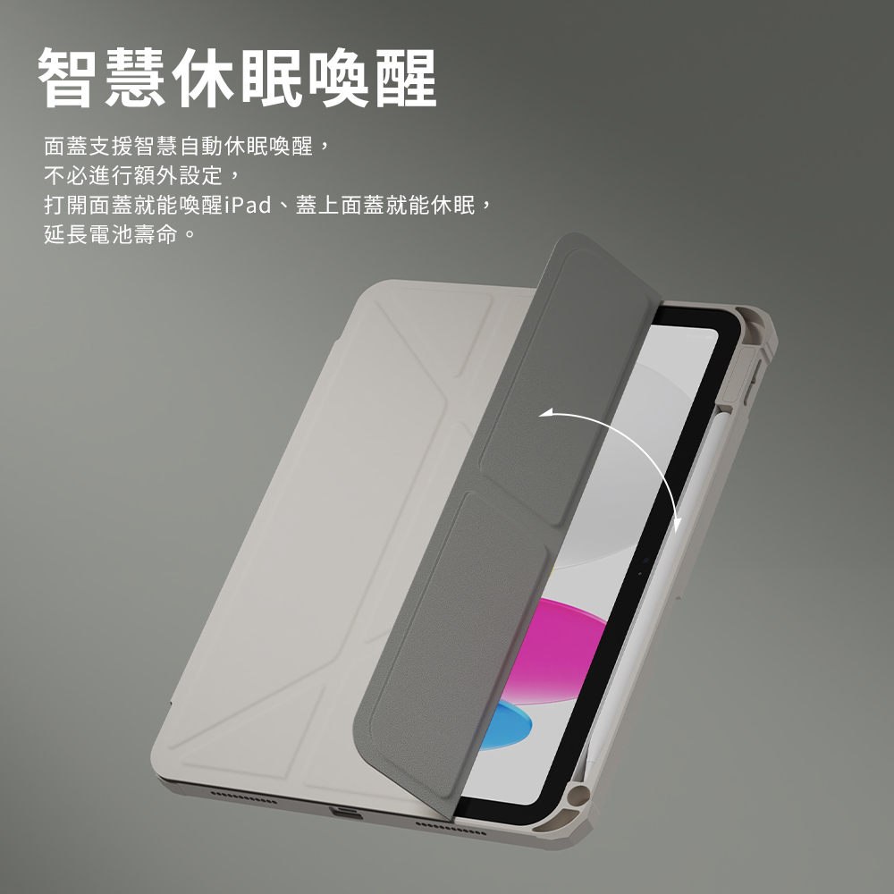 ● 智能休眠、喚醒功能,靈敏偵測,可有效減少iPad耗電,延長其壽命。