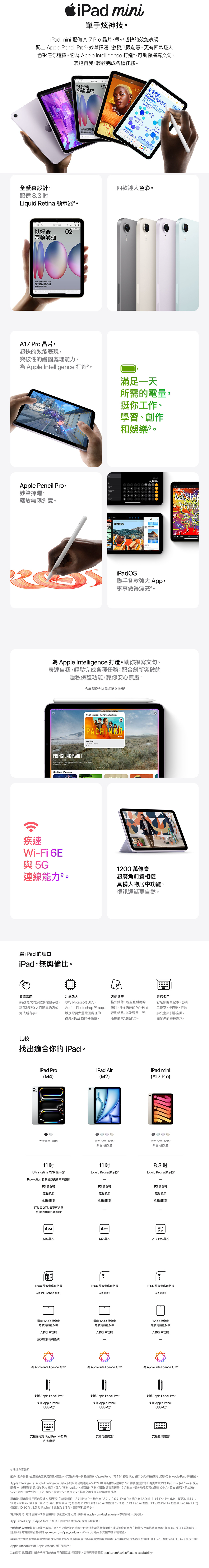 iPad mini,實力非凡又超好攜帶。配備超快的 A17 Pro 晶片和 8.3 吋 Liquid Retina 顯示器,擁有超飆速 Wi-Fi 6E 和 5G,還可搭配 Apple Pencil Pro 使用,到哪都能學習、工作、娛樂和創作。