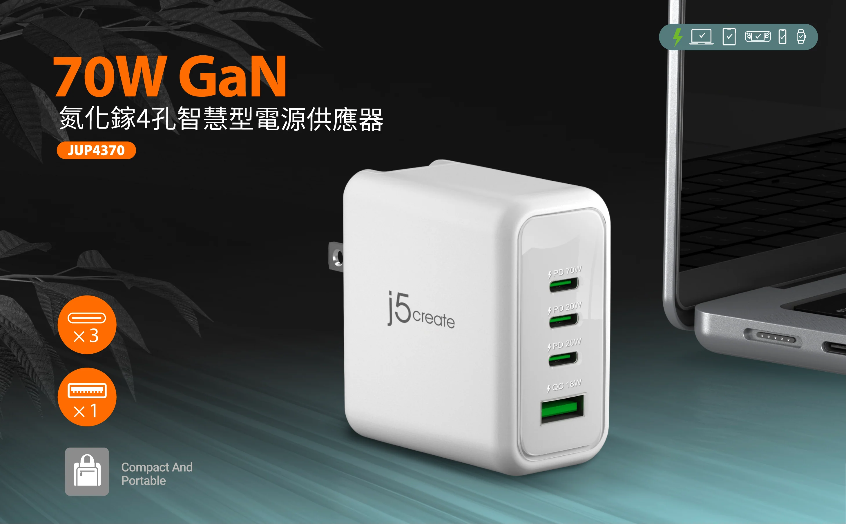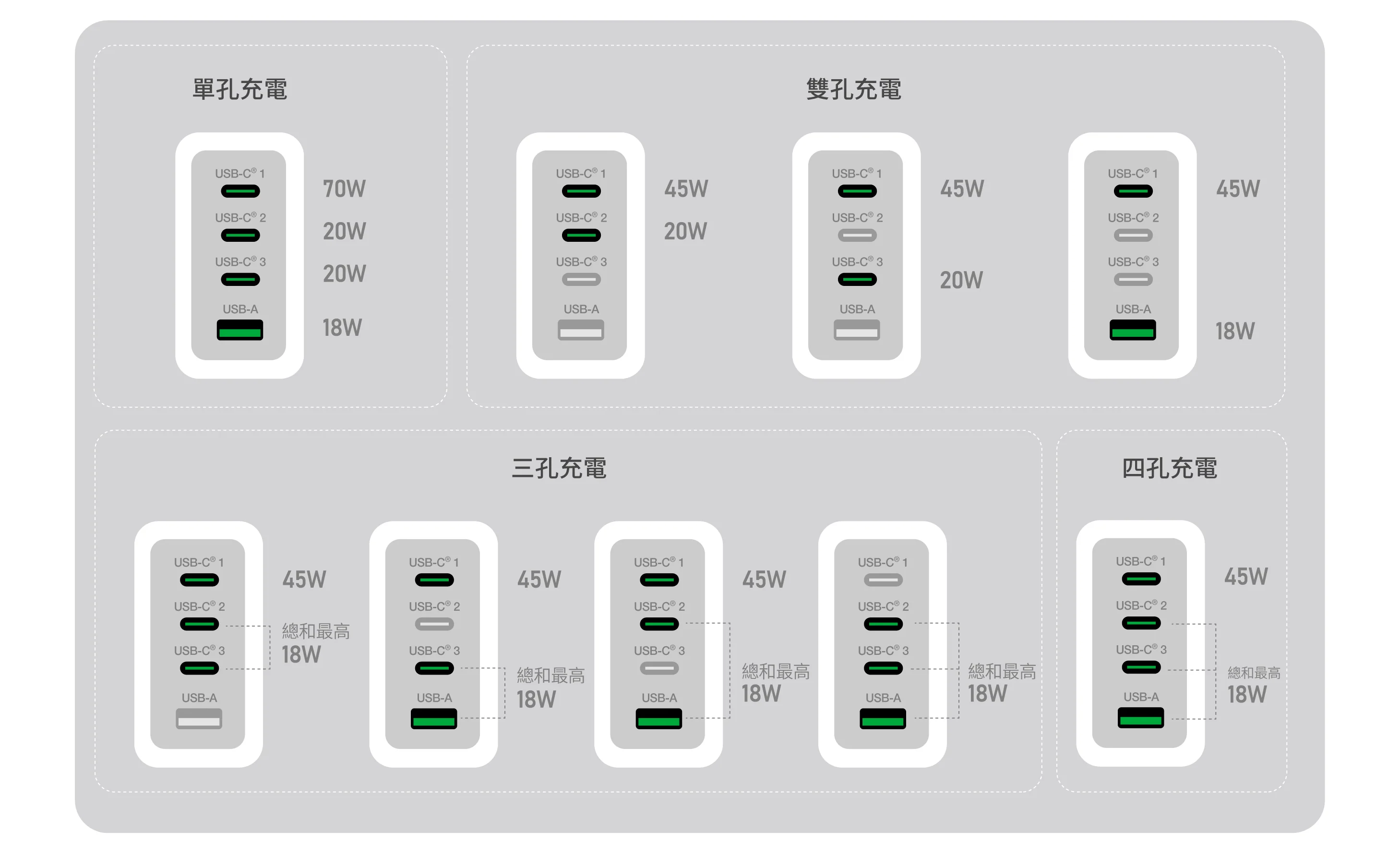 - 搭載GaN技術,配備三個USB-C充電口與一個USB-A充電口,USB-C單埠使用時,最高支援PD 70W輸出。