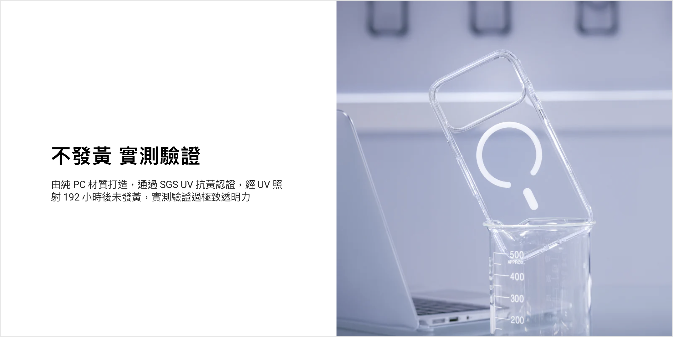 - 由純 PC 材質打造,通過 SGS UV 抗黃認證,經 UV 照射 192 小時後未發黃,實測驗證過極致透明力