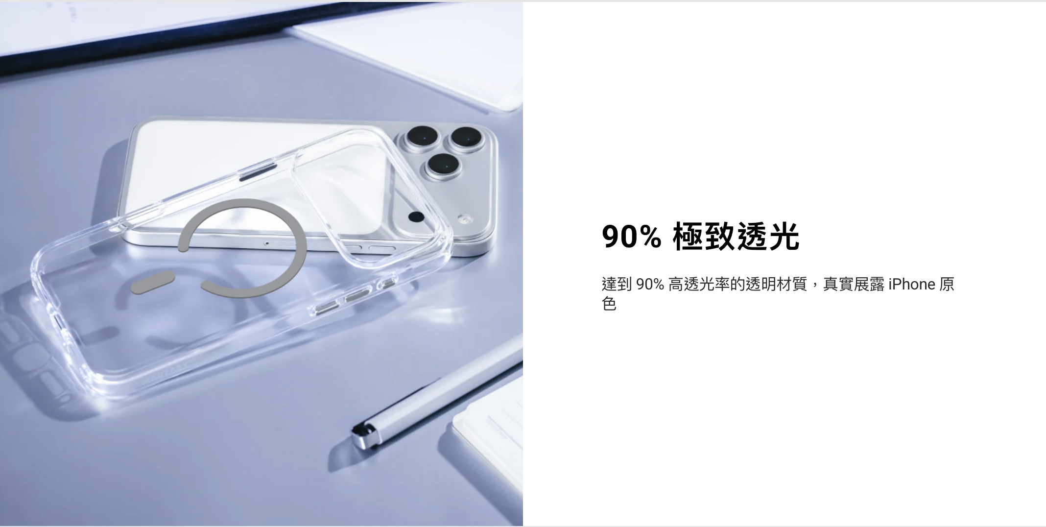 - 達到 90% 高透光率的透明材質,真實展露 iPhone 原色