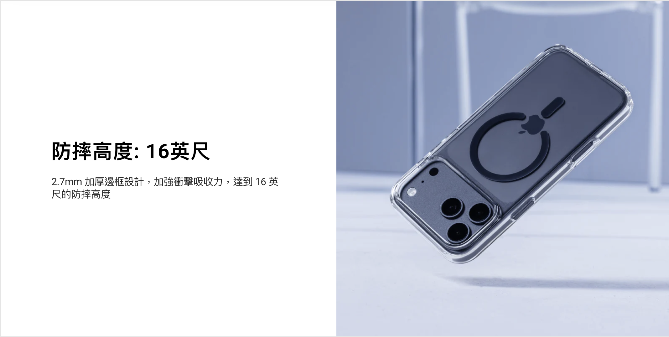 - 2.7mm 加厚邊框設計,加強衝擊吸收力,達到 16 英尺的防摔高度