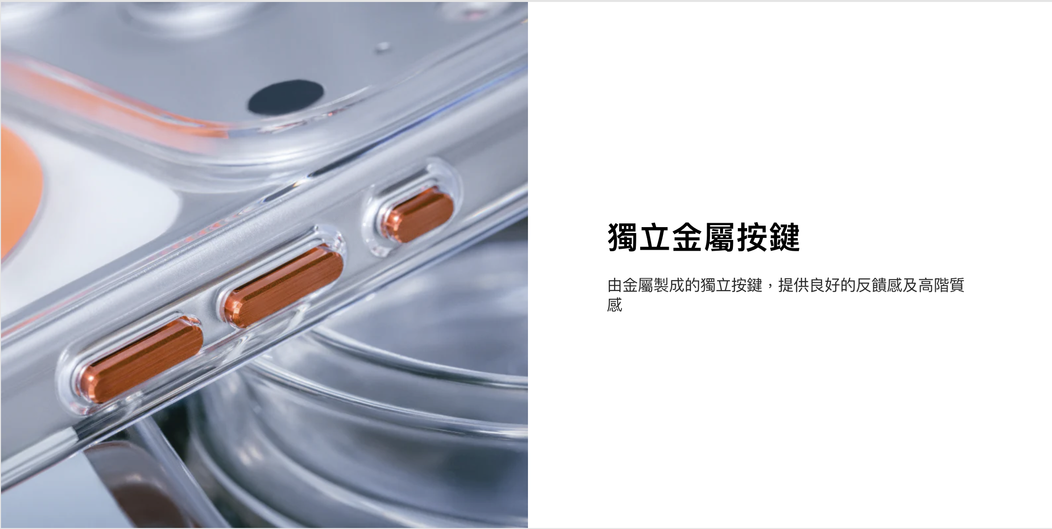 - 由金屬製成的獨立按鍵,提供良好的反饋感及高階質感