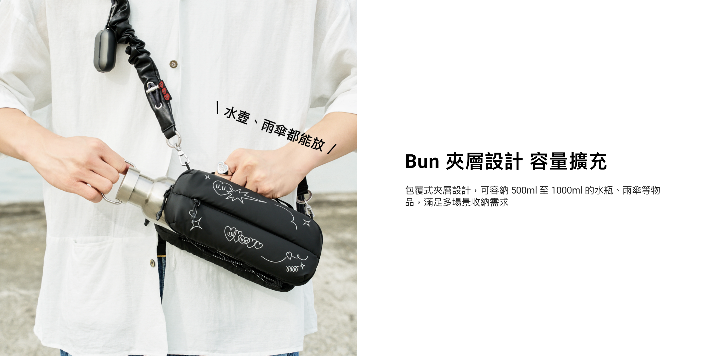 - 包覆式夾層設計,可容納 500ml 至 1000ml 的水瓶、雨傘等物品,滿足多場景收納需求