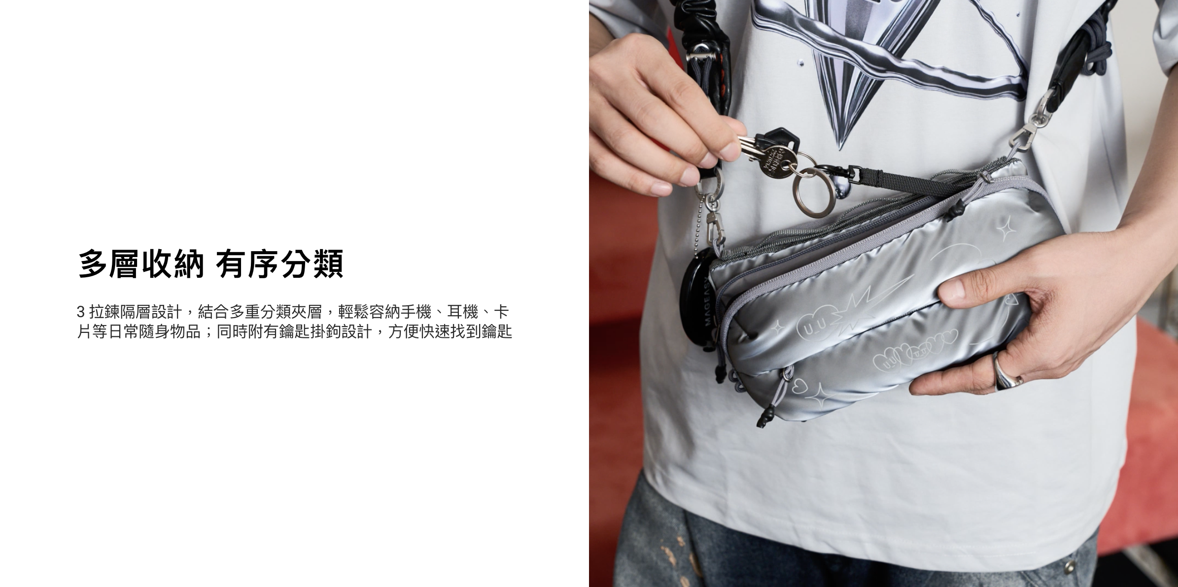 - 3拉鍊隔層設計,結合多重分類夾層,輕鬆容納手機、耳機、卡片等日常隨身物品;同時附有鑰匙掛鉤設計,方便快速找到鑰匙