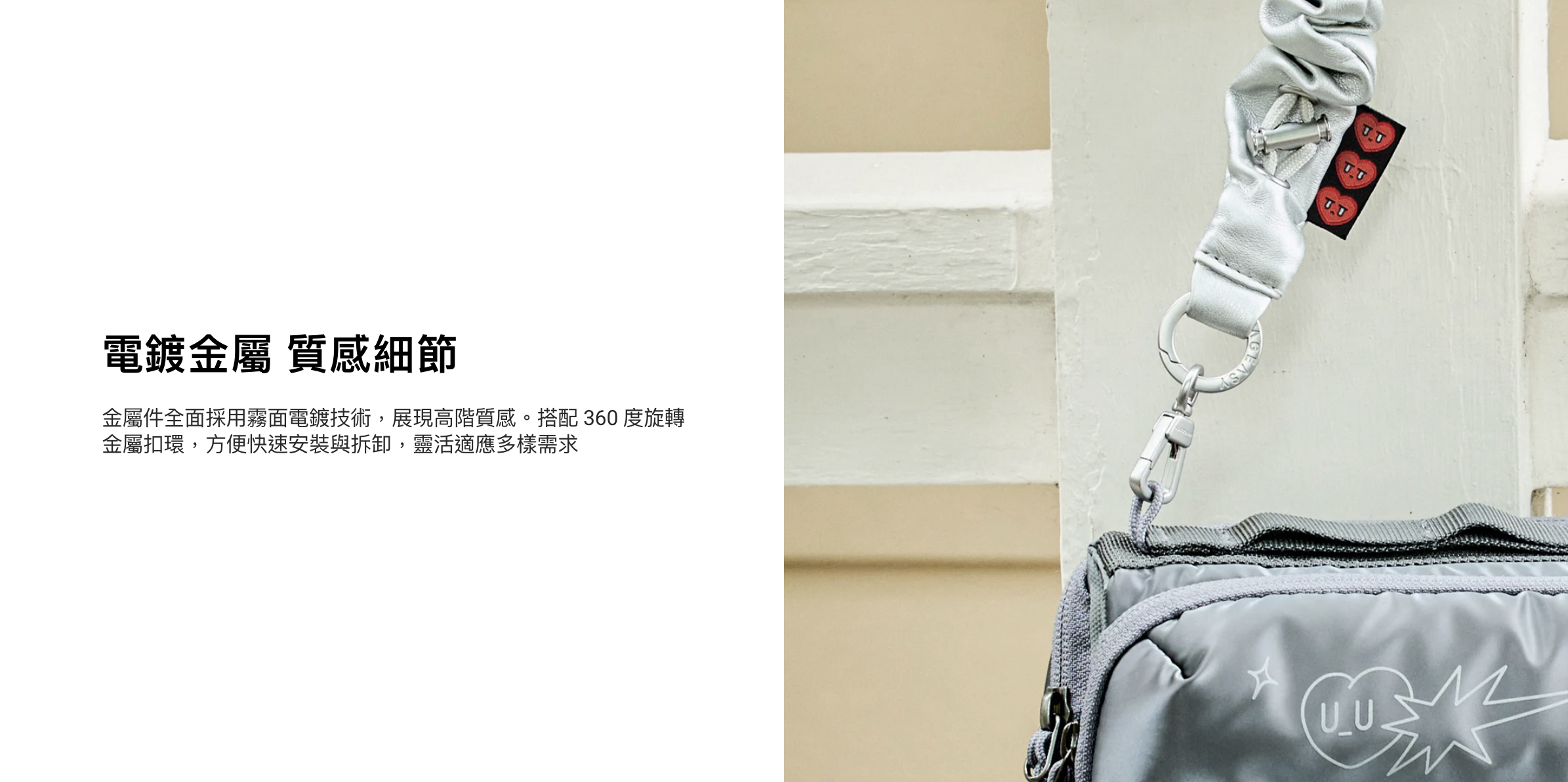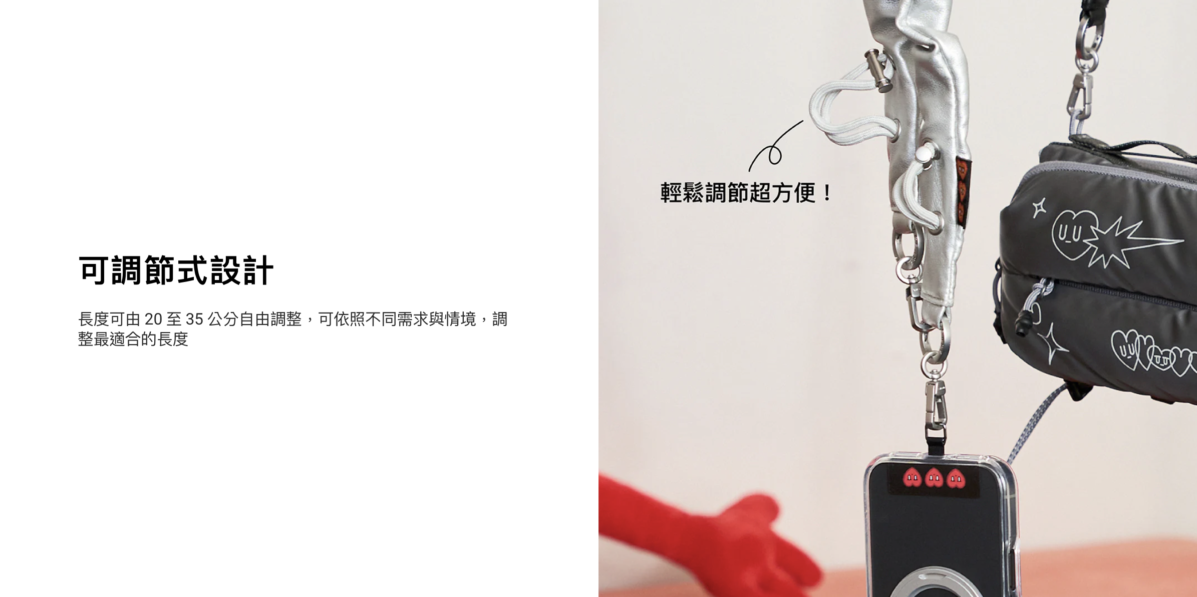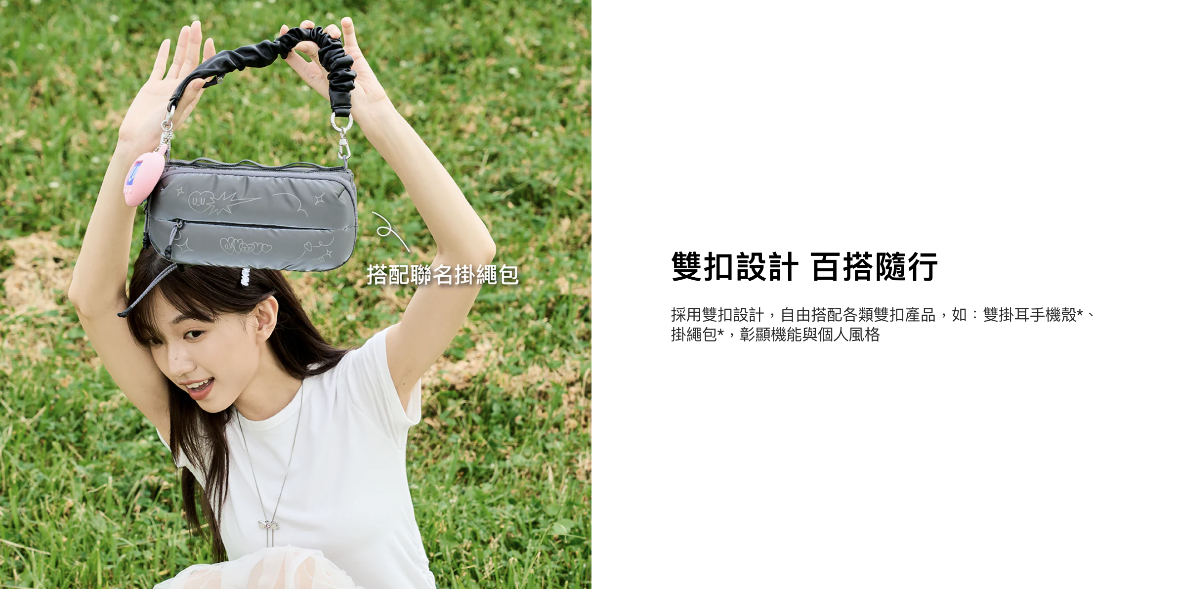 - 採用雙扣設計,自由搭配各類雙扣產品,如:雙掛耳手機殼、掛繩包,彰顯機能與個人風格