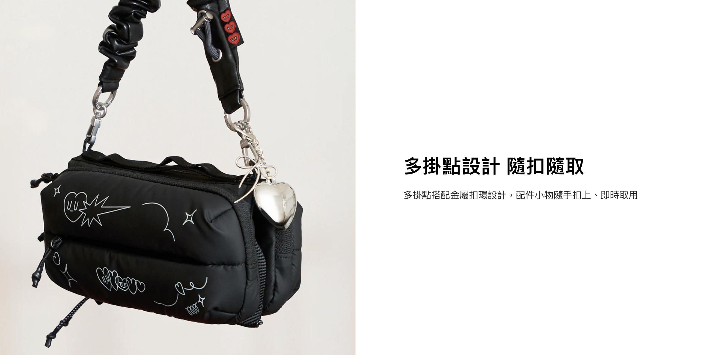 - 多掛點搭配金屬扣環設計,配件小物隨手扣上、即時取用