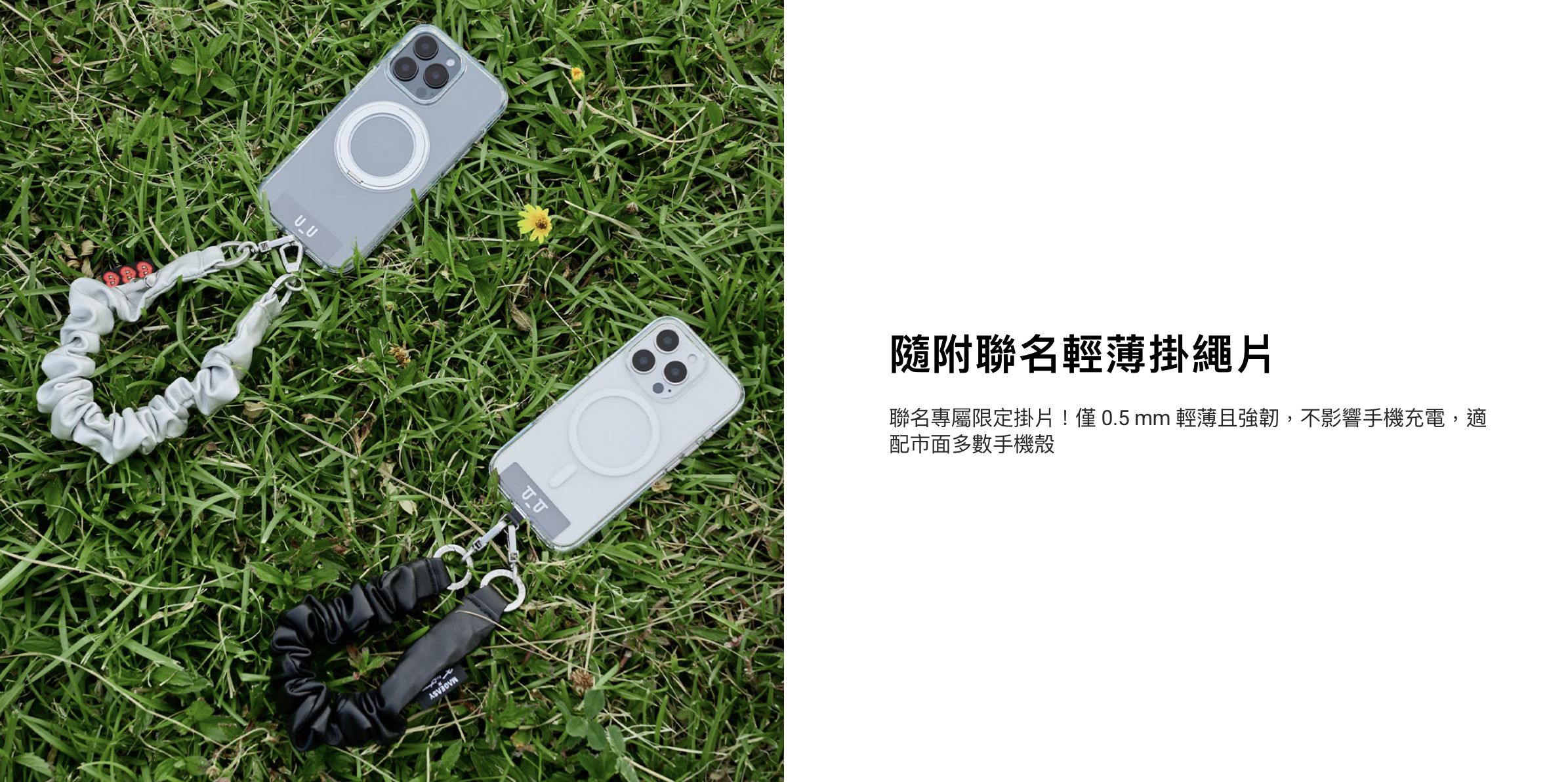- 聯名專屬限定掛片!僅 0.5 mm 輕薄且強韌,不影響手機充電,適配市面多數手機殼