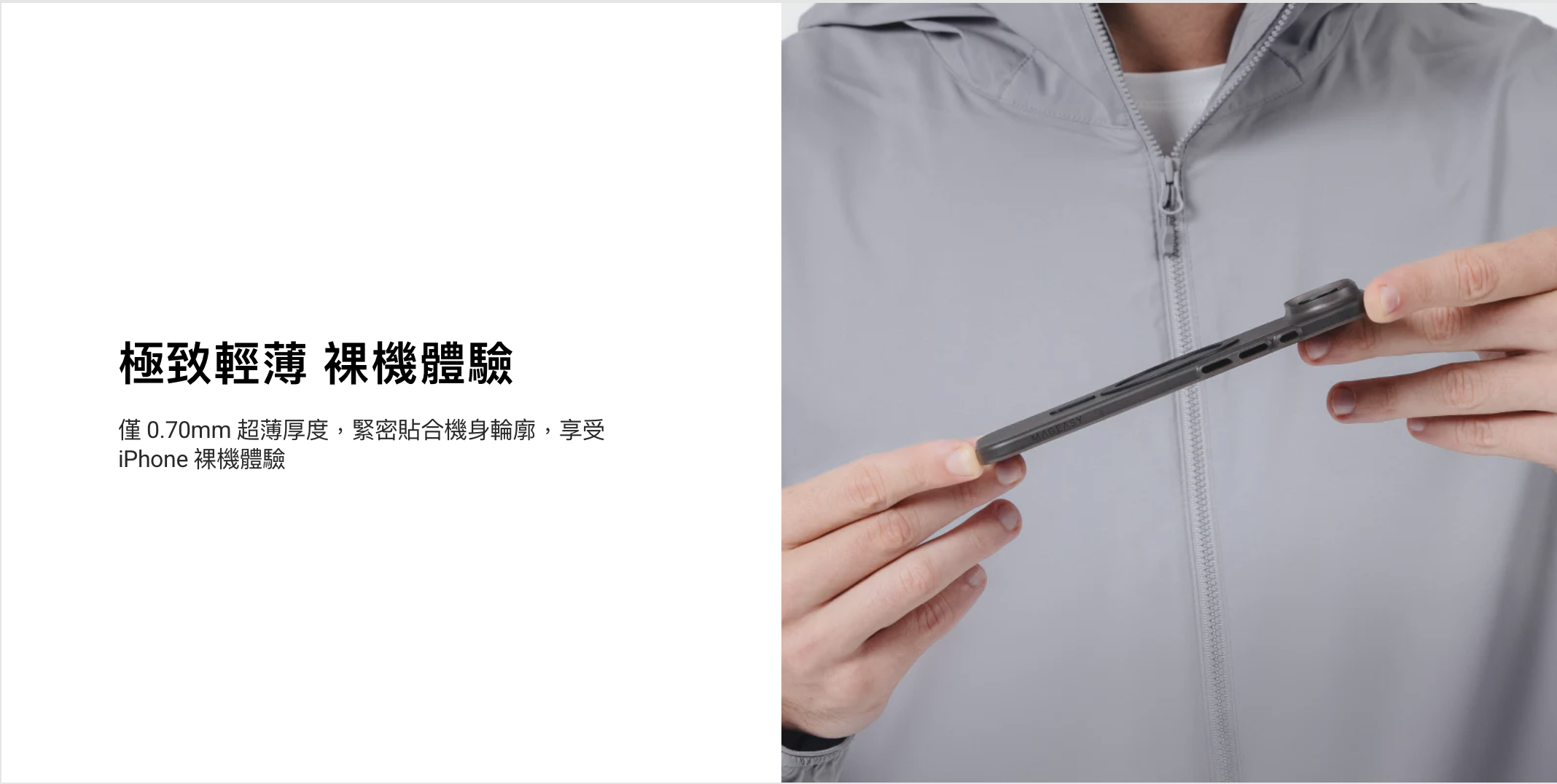 - 僅 0.70mm 超薄厚度,緊密貼合機身輪廓,享受 iPhone 裸機體驗