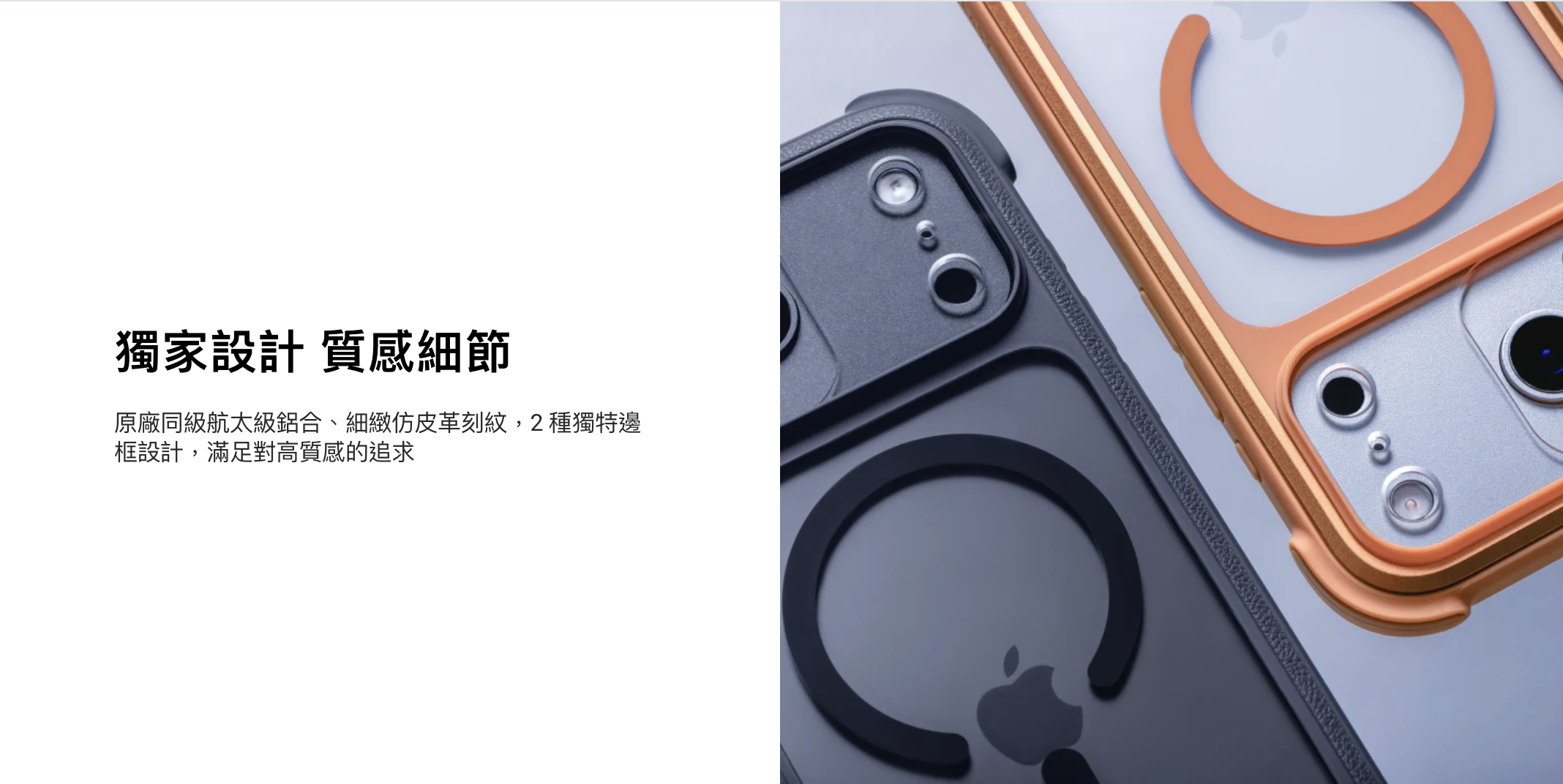 - 原廠同級航太級鋁合、細緻仿皮革刻紋,2 種獨特邊框設計,滿足對高質感的追求