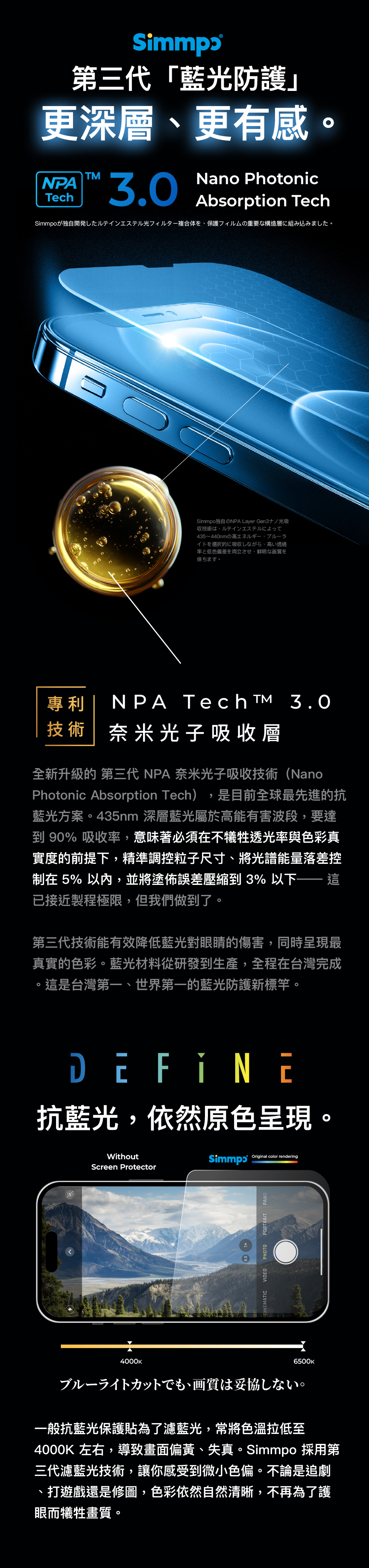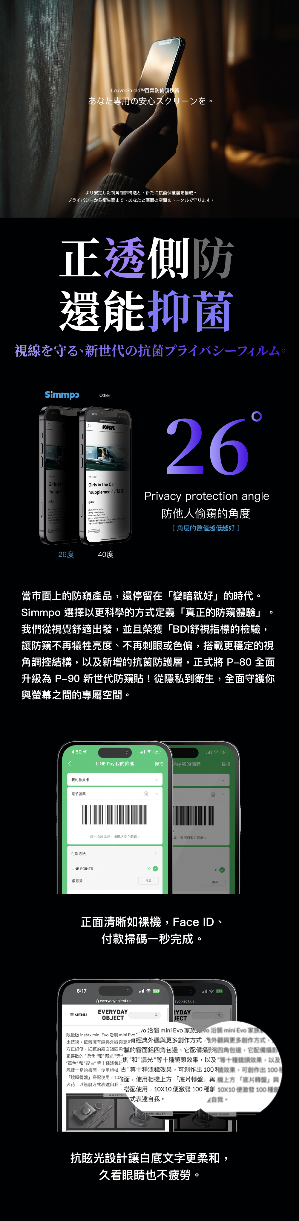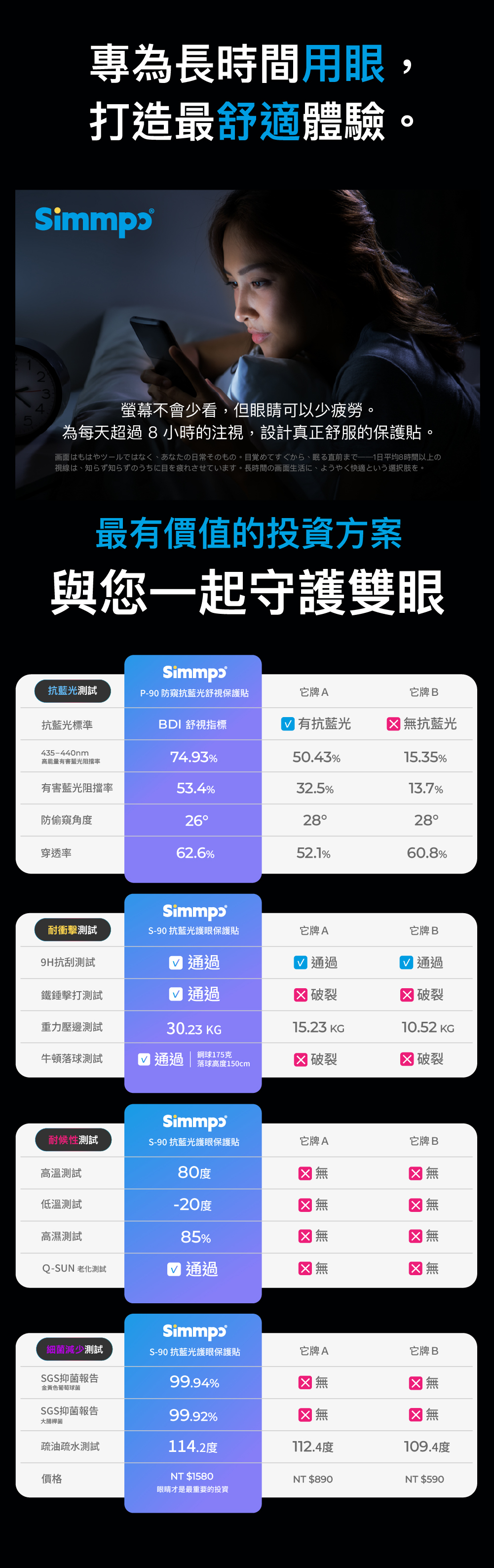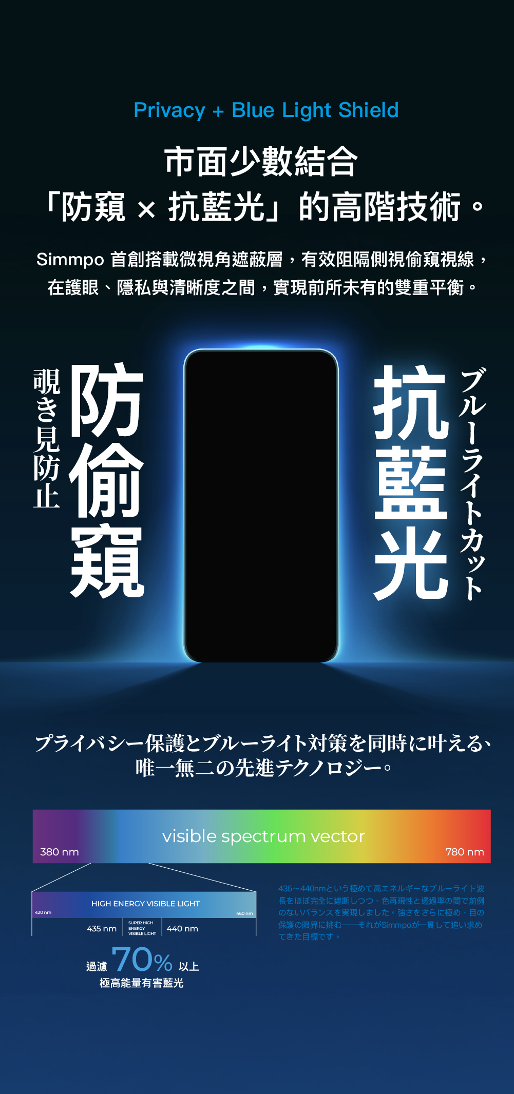 Simmpo首創搭載微視角遮蔽層,有效阻隔側視偷窺視線,在護眼、隱私與清晰度之間,實現前所未有的雙重平衡。