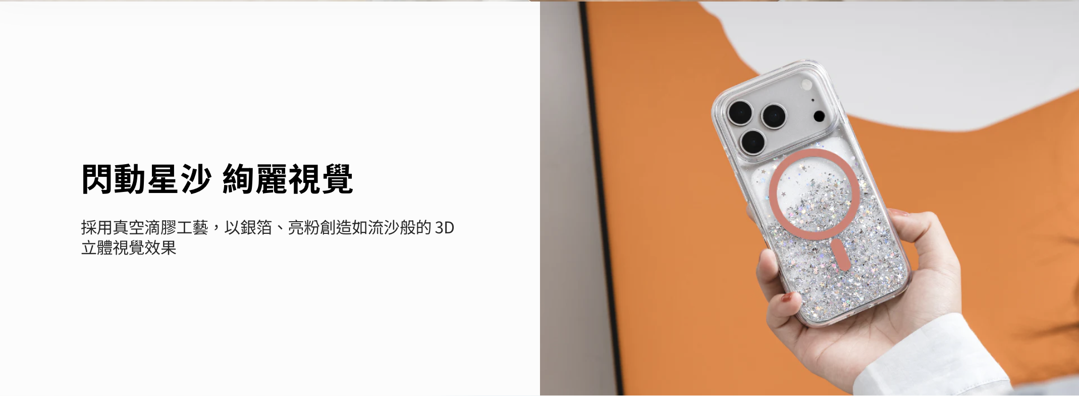 - 採用真空滴膠工藝,以銀箔、亮粉創造如流沙般的 3D 立體視覺效果