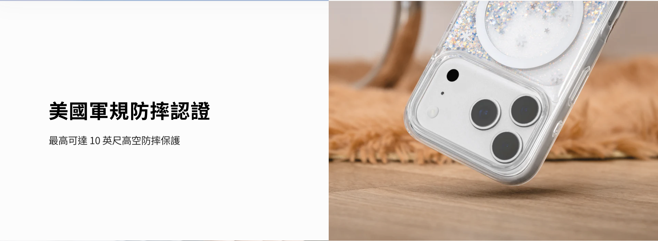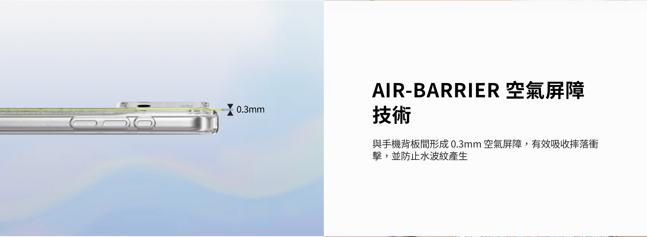 - 與手機背板間形成 0.3mm 空氣屏障,有效吸收摔落衝擊,並防止水波紋產生