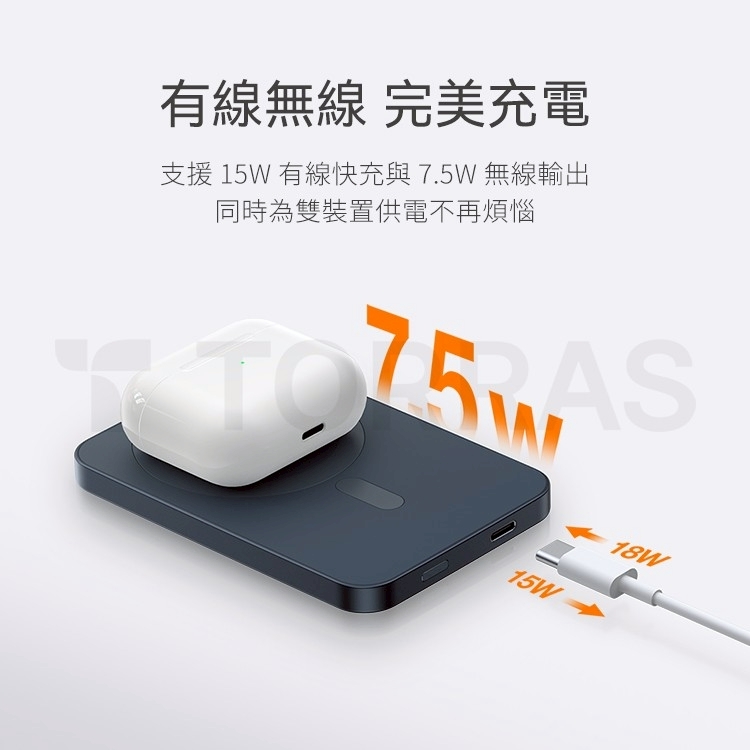 - Qi2 行動電源快充認證,支援 15W 無線快充、20W 有線快充