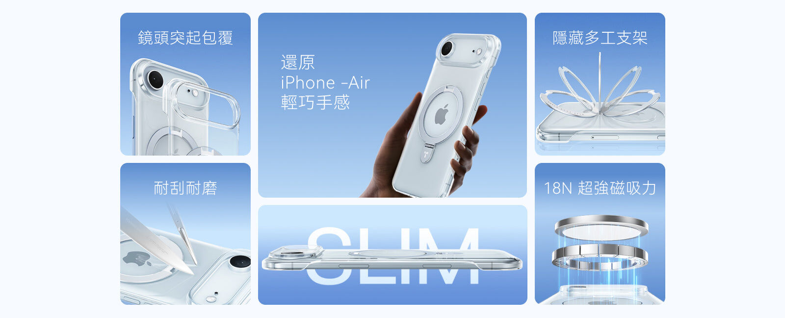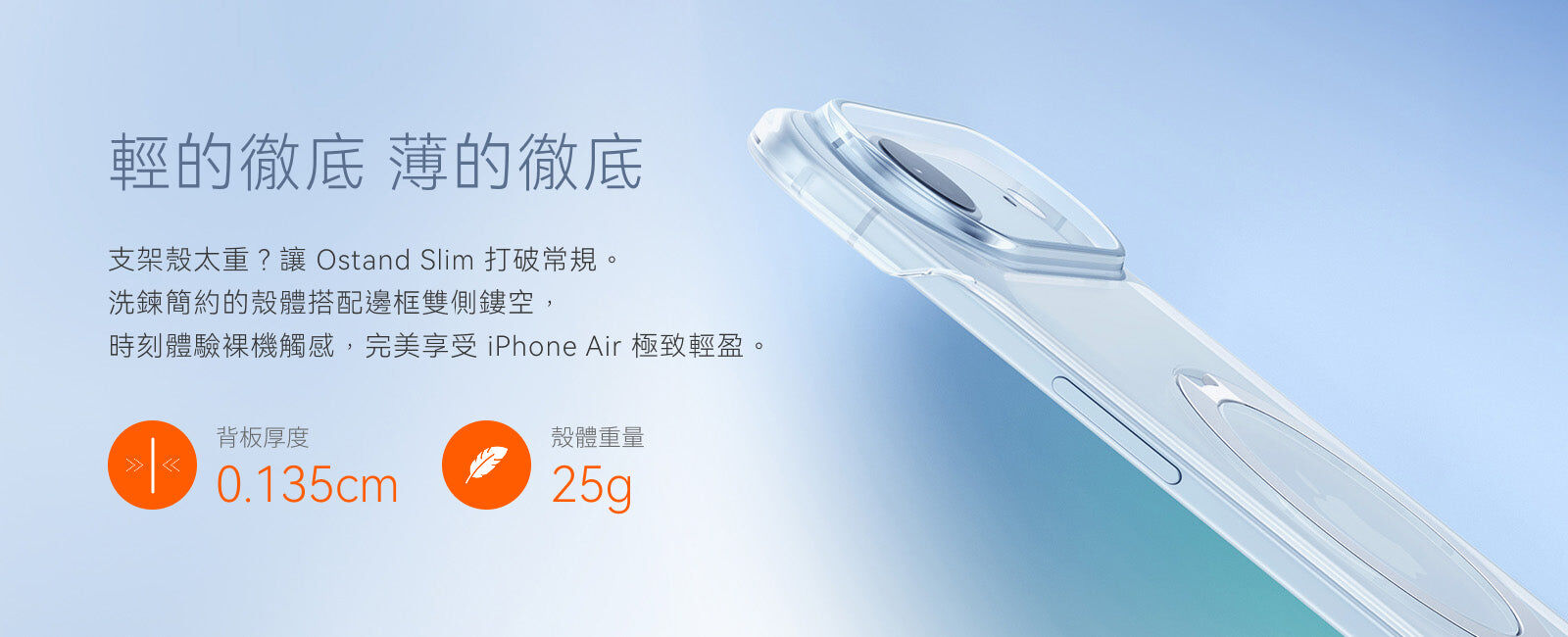 - 超薄簡潔無邊框殼體,雙側鏤空體驗裸機觸感,輕鬆享受 iPhone 17 Air 輕薄設計