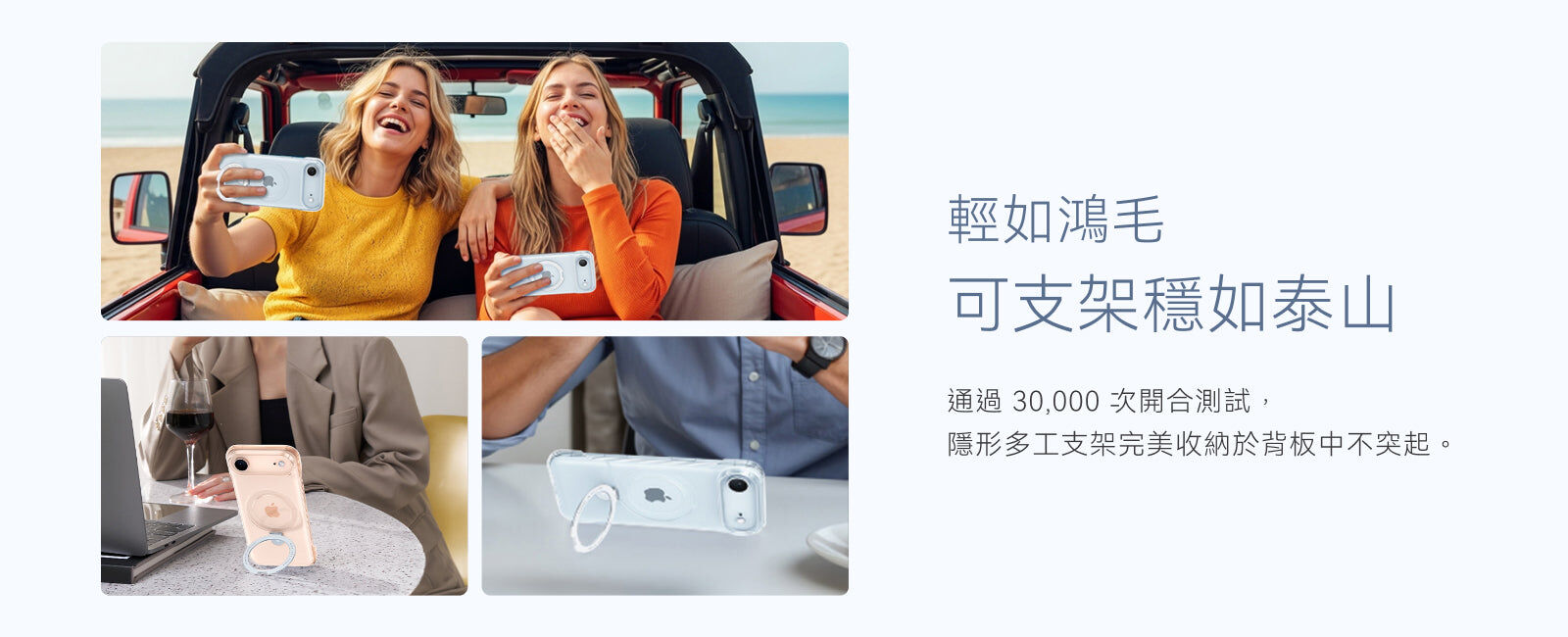 - 通過 30,000 次耐用測試,凹槽設計方便拿取,航太級 O 型鋁合金隱藏支架好收納,完美貼合手機背板不翹起