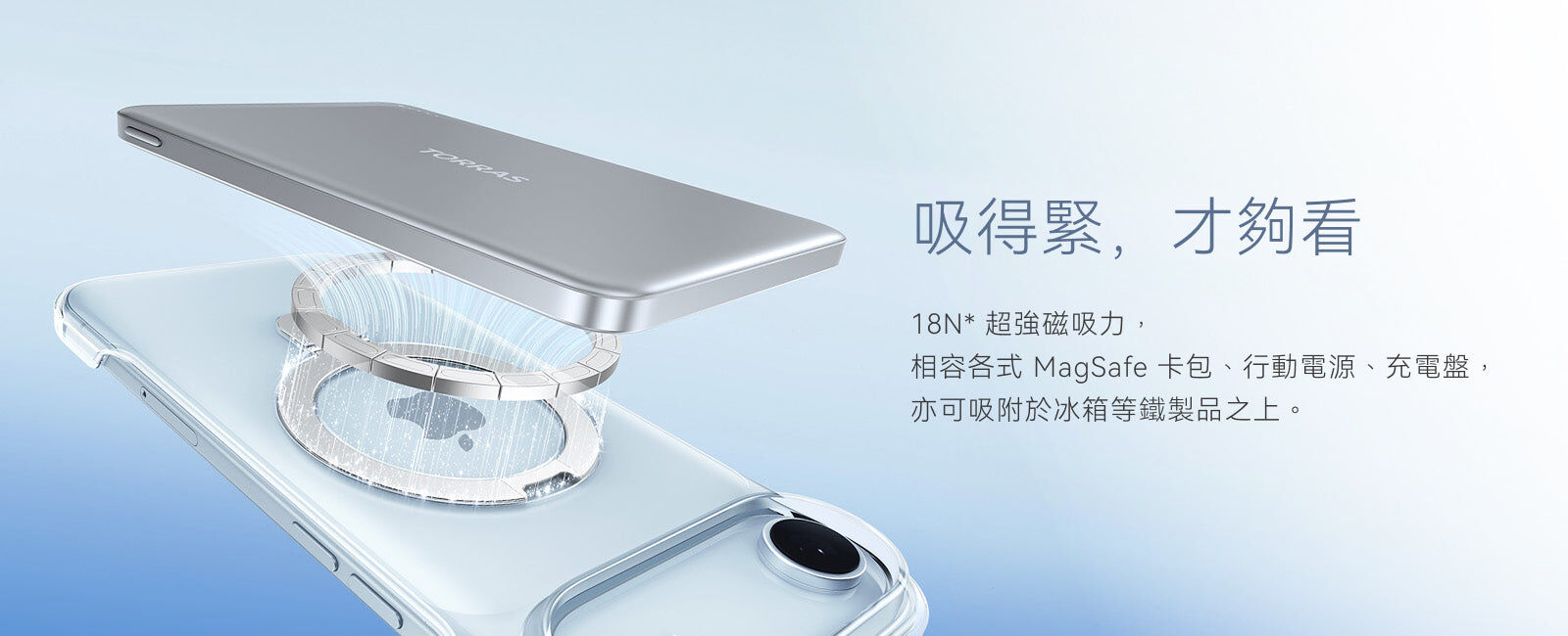 - 18N 超強磁力,相容各式 MagSafe 卡包、行動電源、充電盤,亦可吸附於冰箱等鐵製品之上