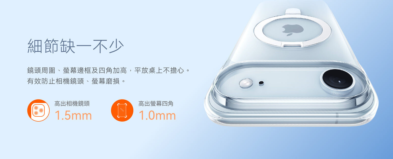 - 鏡頭周圍、螢幕四角加高,有效防止相機鏡頭/螢幕磨損