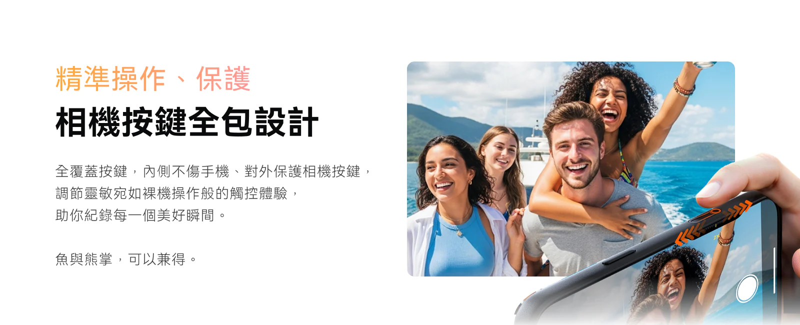 - 相機按鍵全包設計,按鍵內側不傷手機,還原靈敏觸控,紀錄美好瞬間