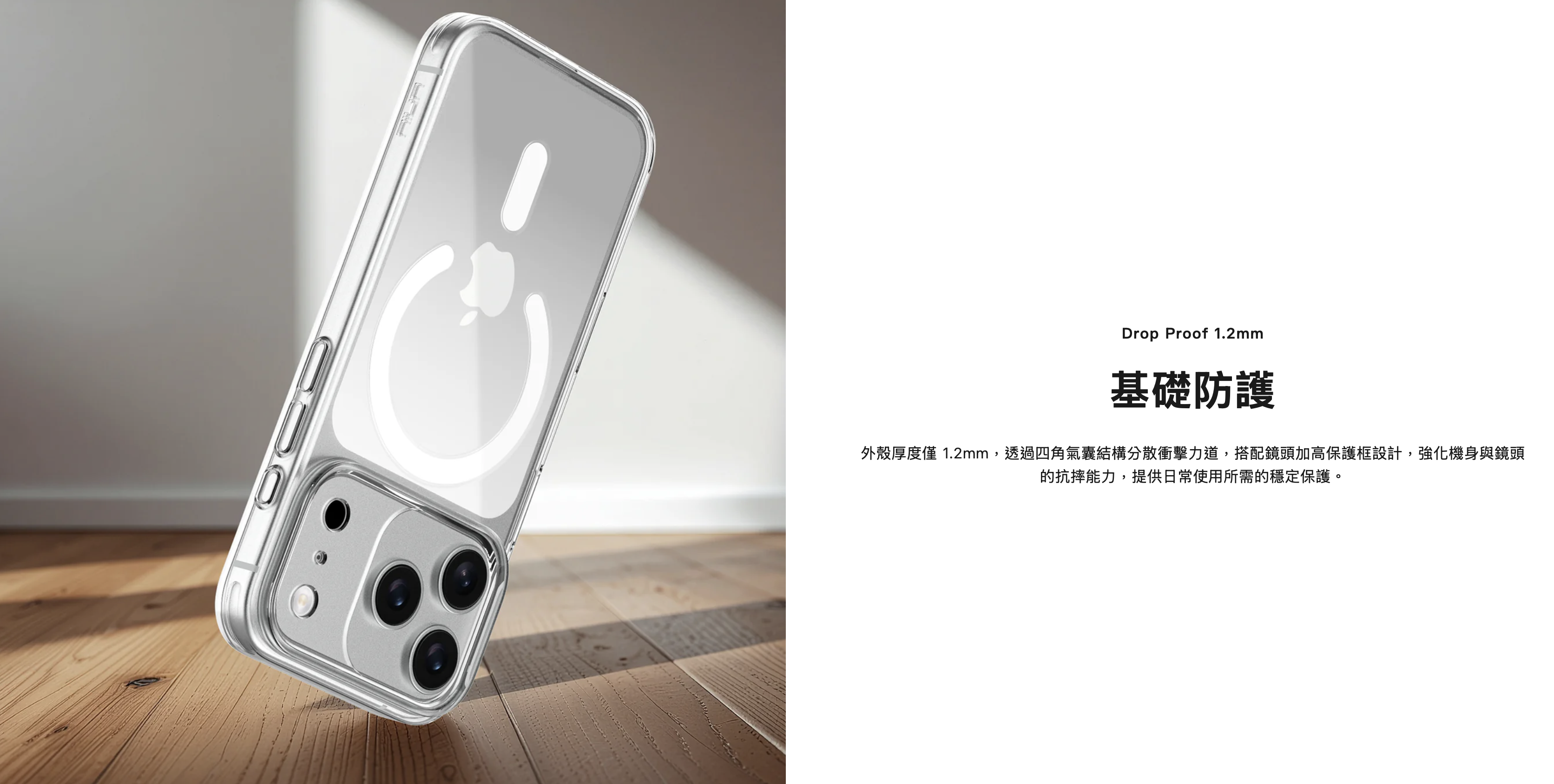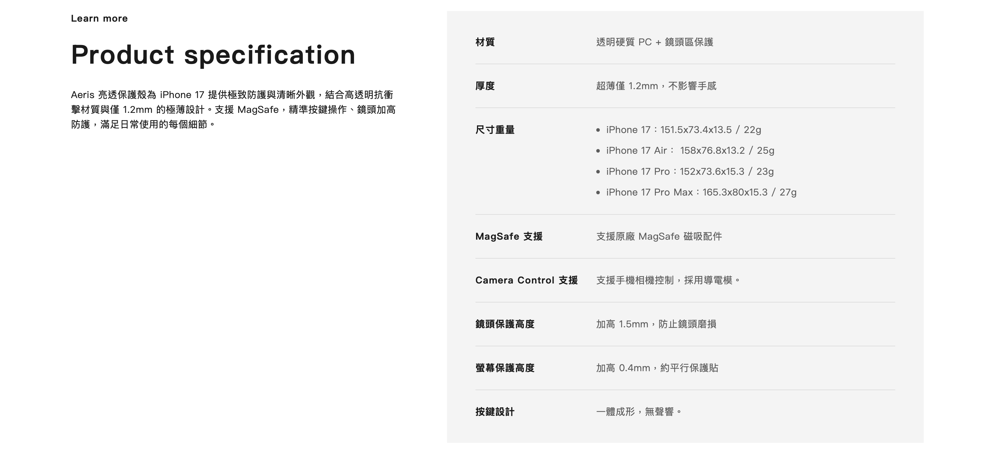 Aeris 亮透保護殼為 iPhone 17 提供極致防護與清晰外觀,結合高透明抗衝擊材質與僅 1.2mm 的極薄設計。支援 MagSafe,精準按鍵操作、鏡頭加高防護,滿足日常使用的每個細節。
