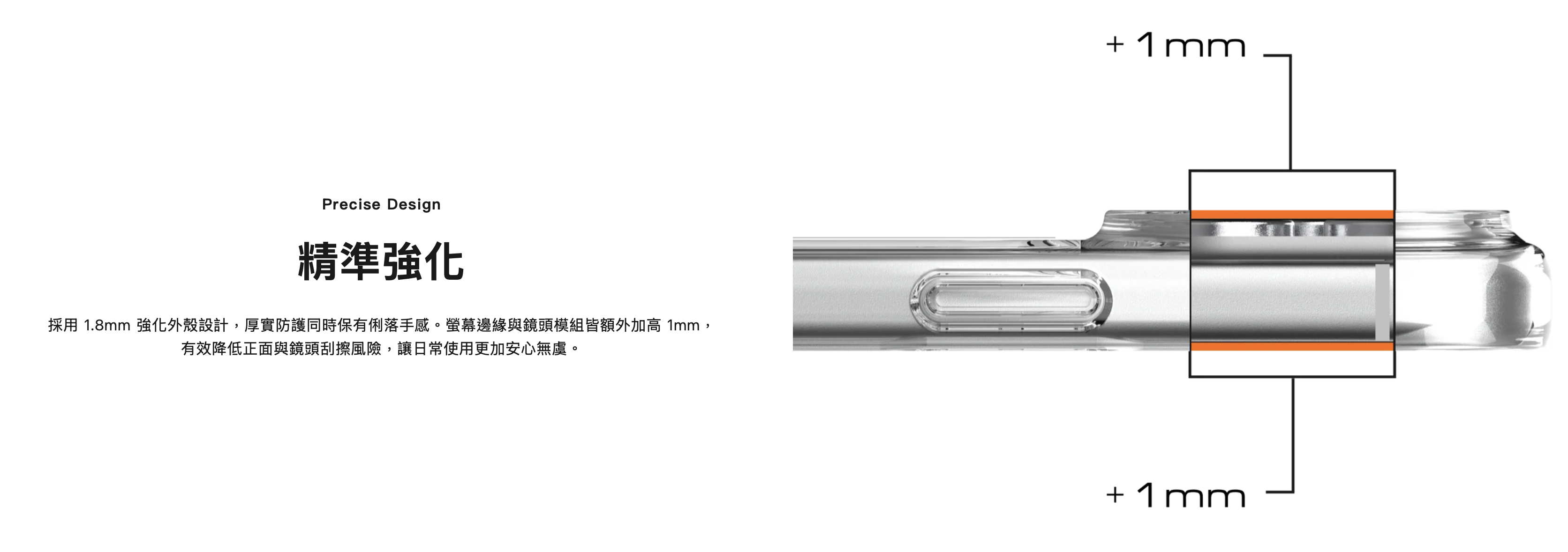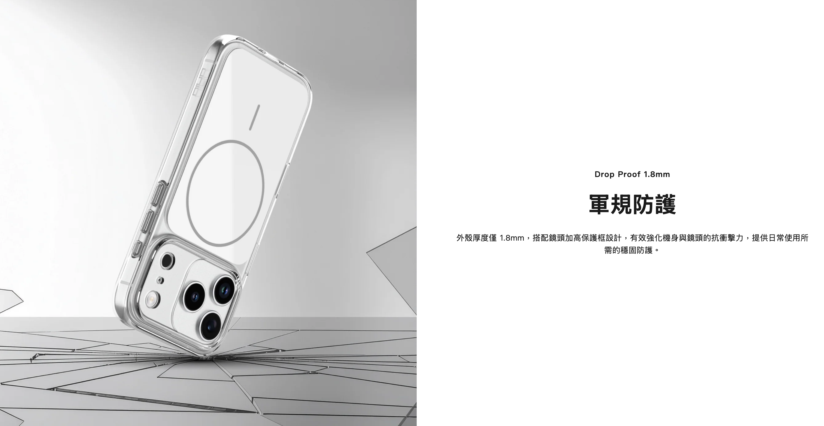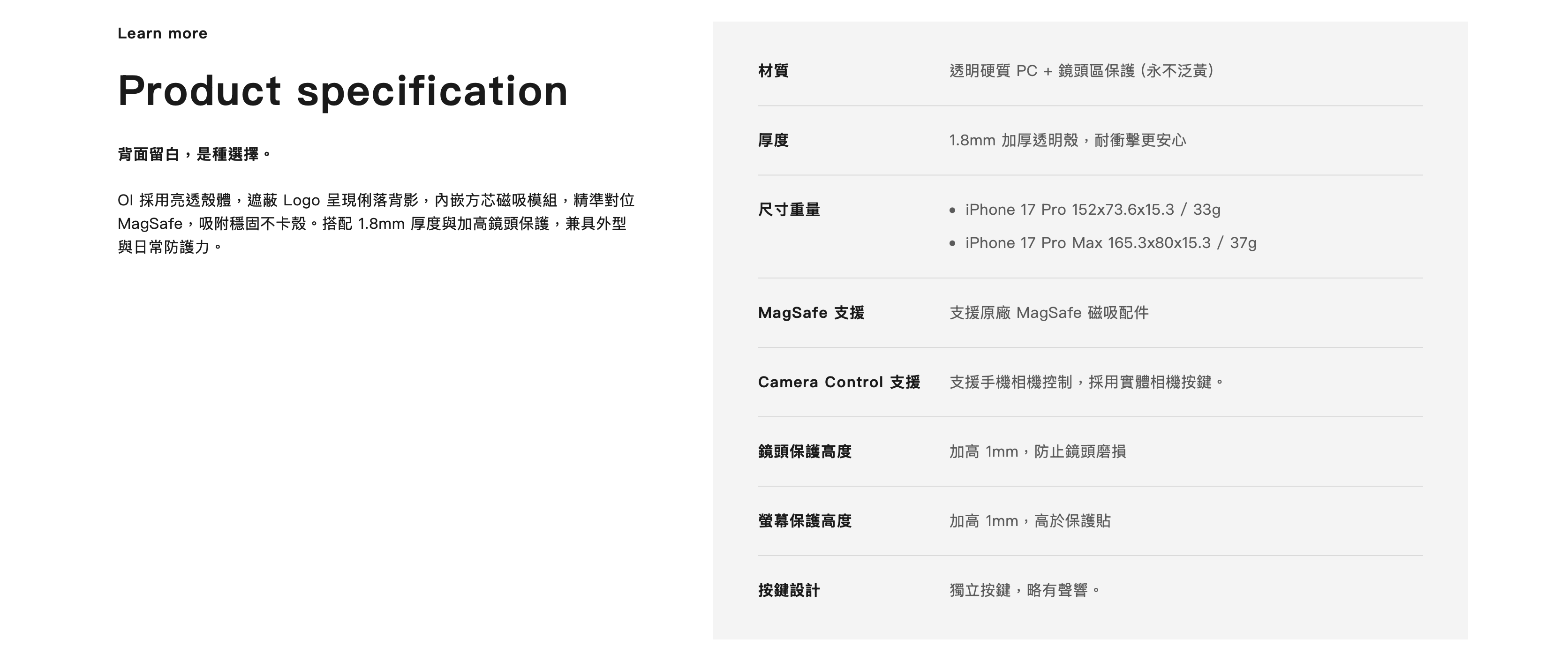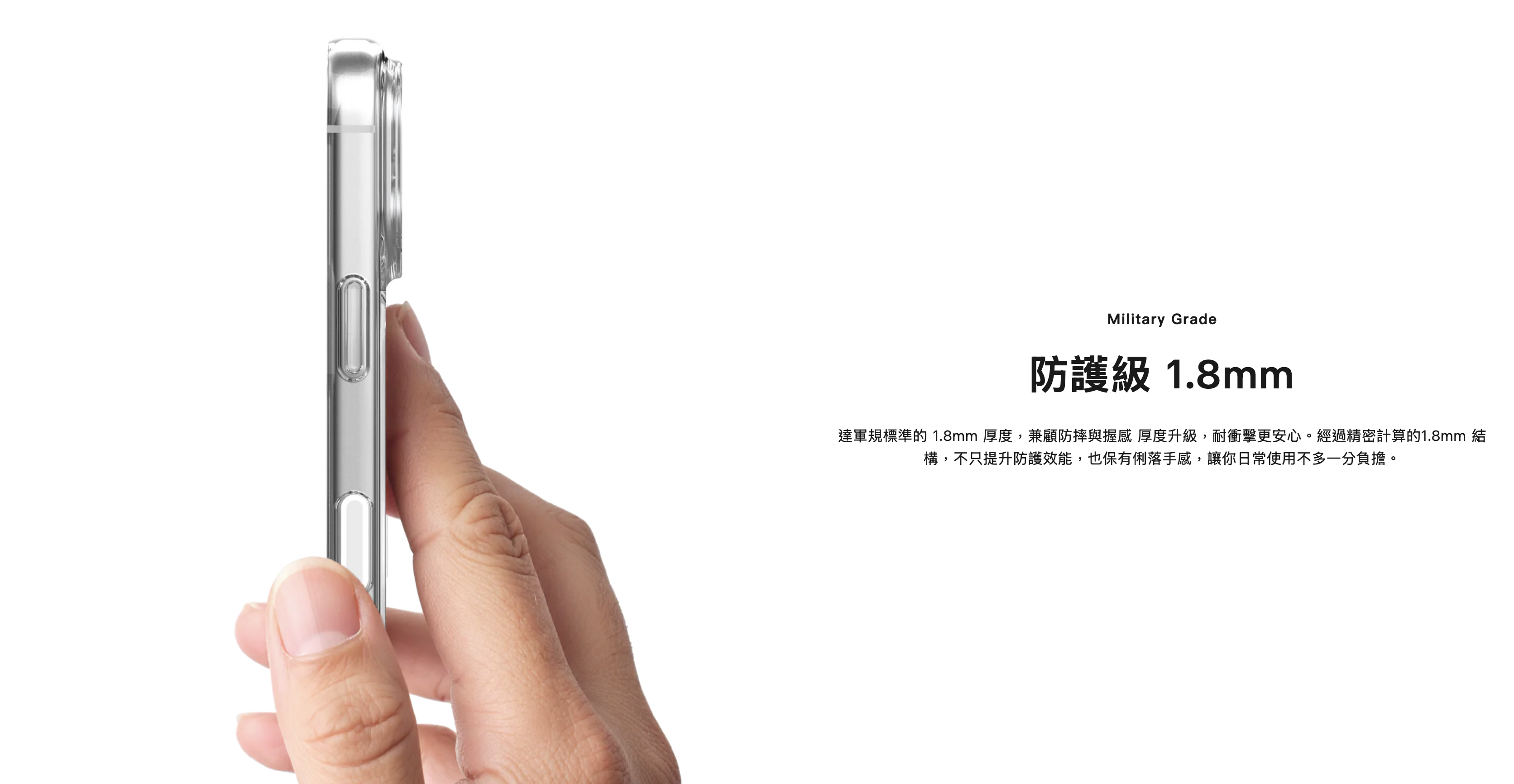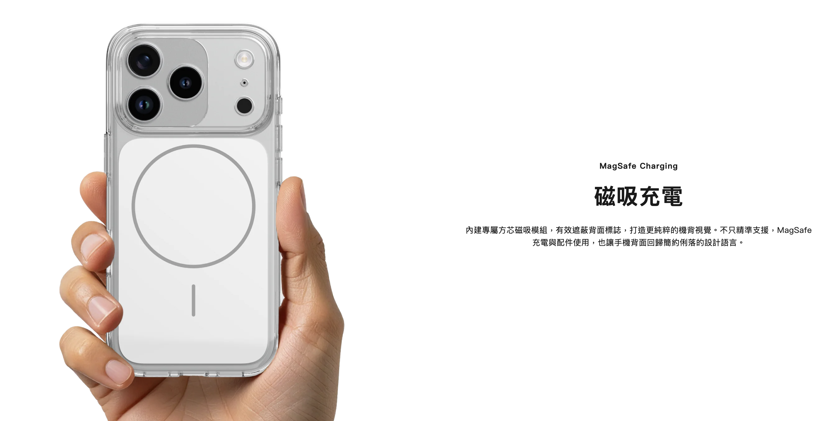 OI 採用亮透殼體,遮蔽 Logo 呈現俐落背影,內嵌方芯磁吸模組,精準對位 MagSafe,吸附穩固不卡殼。搭配 1.8mm 厚度與加高鏡頭保護,兼具外型與日常防護力。