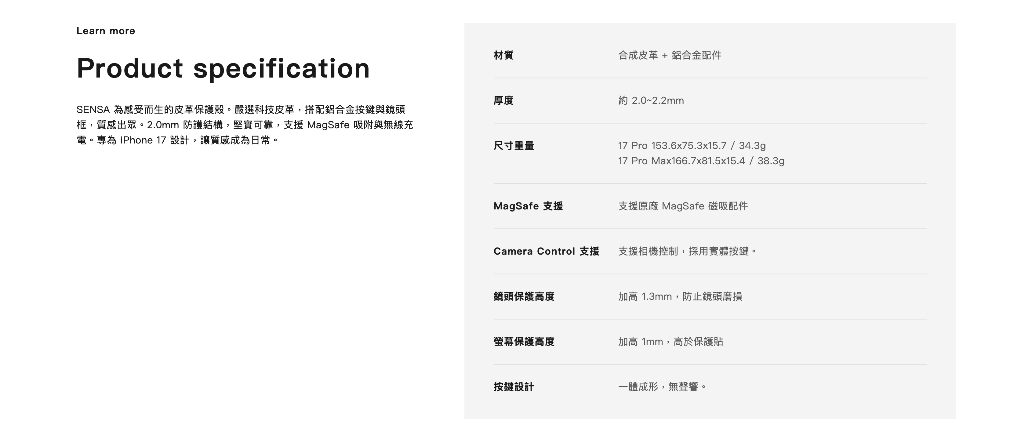SENSA 為感受而生的皮革保護殼。嚴選科技皮革,搭配鋁合金按鍵與鏡頭框,質感出眾。2.0mm 防護結構,堅實可靠,支援 MagSafe 吸附與無線充電。專為 iPhone 17 設計,讓質感成為日常。
